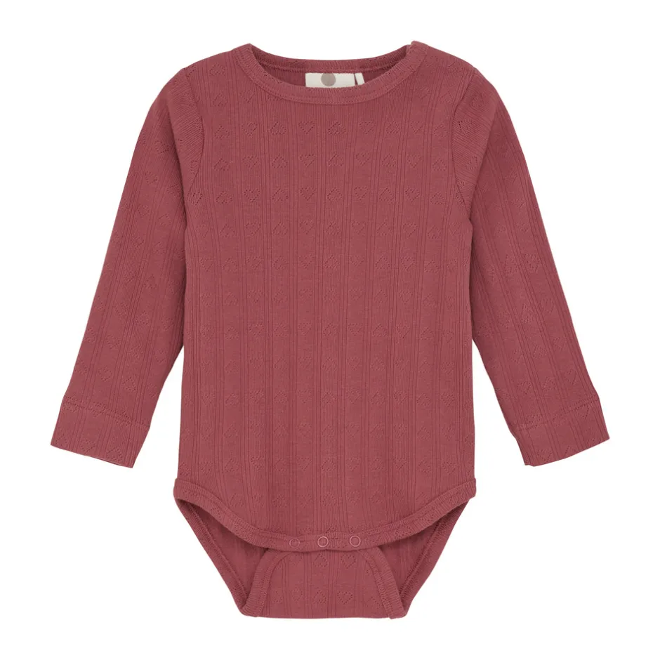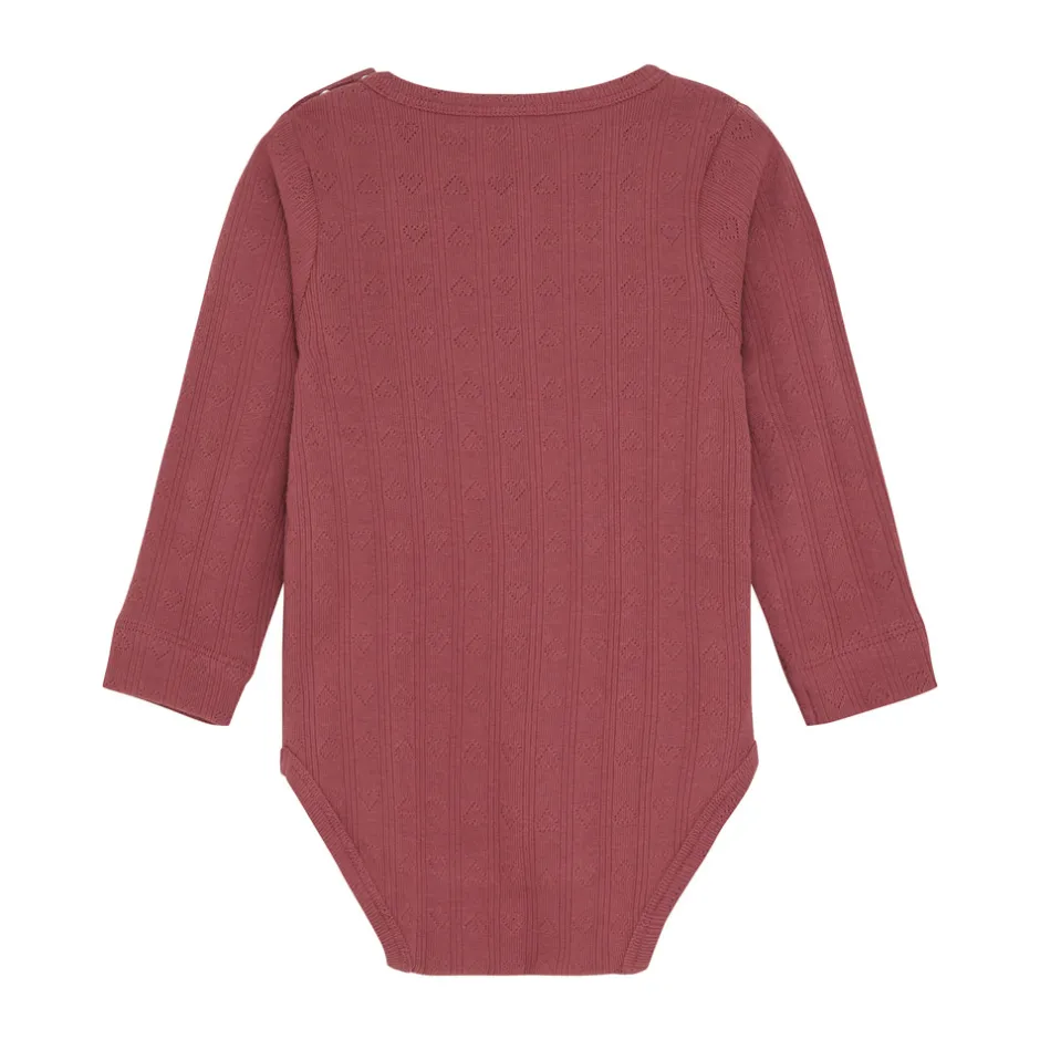 Sød body i pointelle med et elegant ternet mønster. Denne body er fremstillet i en blød og behagelig bomuldskvalitet, der føles skånsom mod den sarte hud. Den har lange ærmer og lukkes praktisk med trykknapper mellem benene, hvilket gør den nem at tage af og på. Et stilfuldt og komfortabelt valg til de mindste.