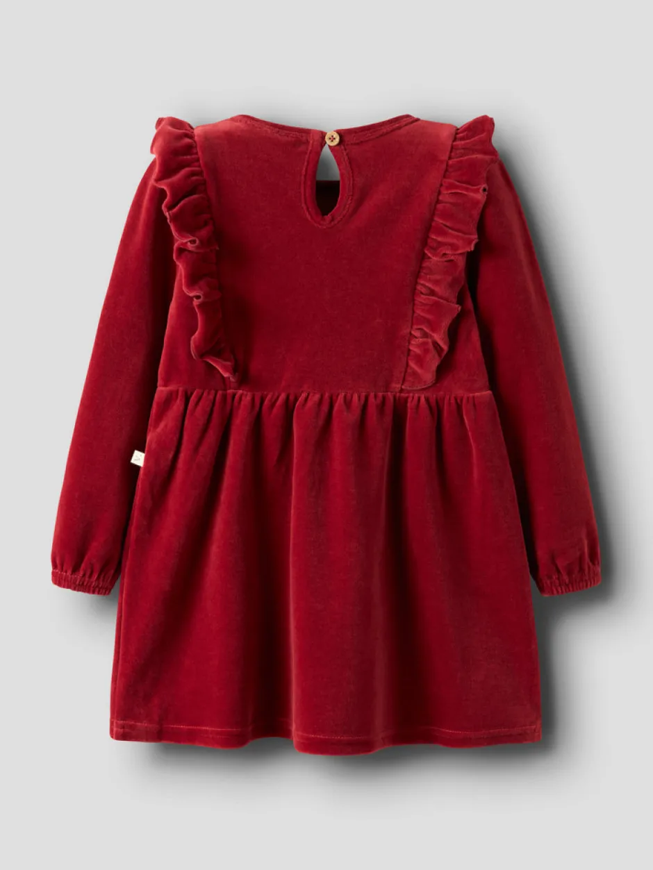 Saga Sag Kjole fra Lil’ Atelier i farven Red Dahlia er en elegant og komfortabel kjole, der passer perfekt til både hverdag og festlige lejligheder. Kjolen er fremstillet i blød velour, som føles behagelig mod huden og giver et eksklusivt udtryk. De fine flæser på fronten tilføjer et sødt og feminint touch, mens den klassiske rund hals og lange ærmer sikrer en god pasform. Med den praktiske knaplukning i nakken er kjolen nem at tage af og på, hvilket gør den ideel til aktive børn. Den dybe røde farve gør kjolen til et oplagt valg til efterår og vinter, og den kan styles med strømpebukser og støvler for et fuldendt look.