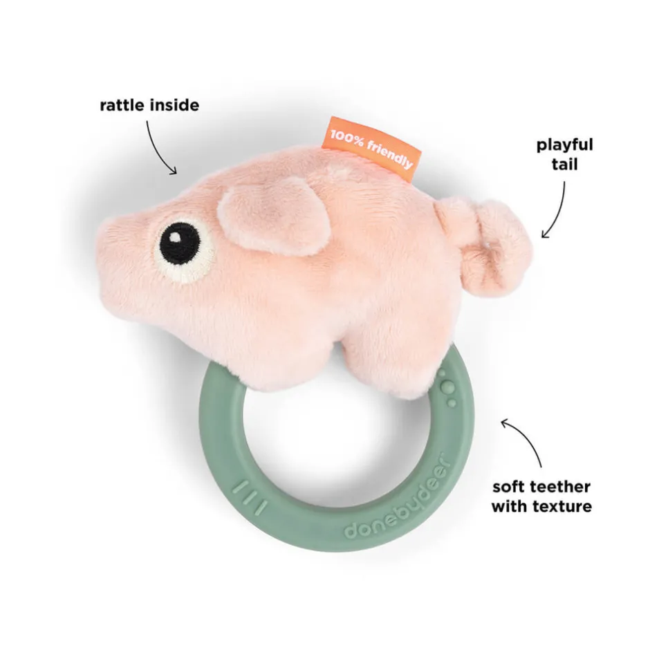 Bideringen i silikone er perfekt til at stimulere og berolige kløende tandkød, hvilket gør den ideel under tandfrembrud. Den fine, rolige farve med kontrastfarver giver visuel stimulering, der fanger dit barns opmærksomhed.