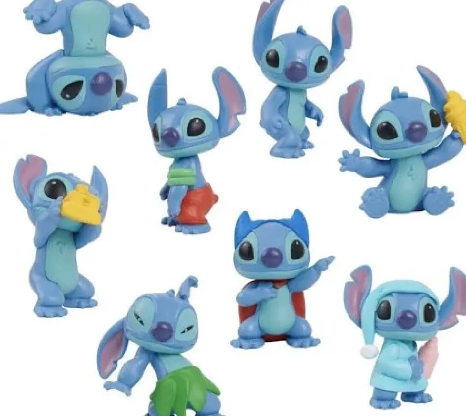 Sæt med 8 legetøjsfigurer, der forestiller Stitch i forskellige outfits og situationer. Hver figur måler 7 cm i højden.
