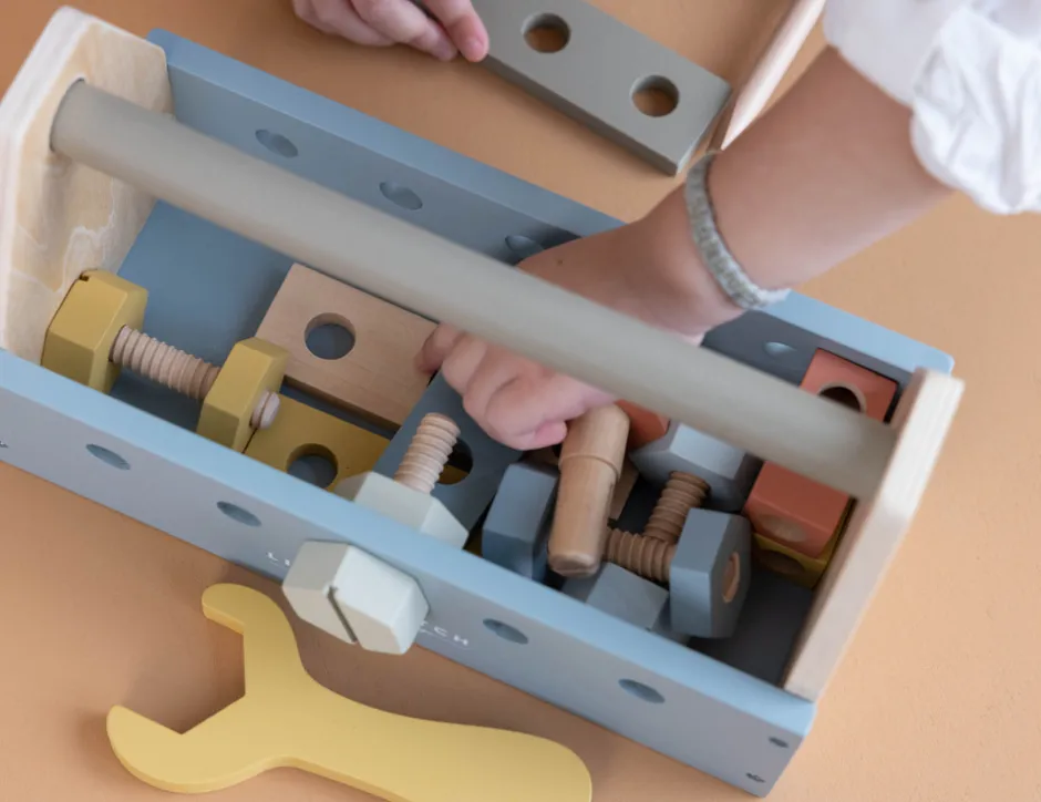 Hjælp med gøremål i huset! Little Dutch værktøjskasse består af 20 dele i bløde mynte og blå farve toner. Værktøjskassen garanterer en masse sjov for alle små handyman i huset. Dit barn kan både lege og lære gode motoriske færdigheder på samme tid.
