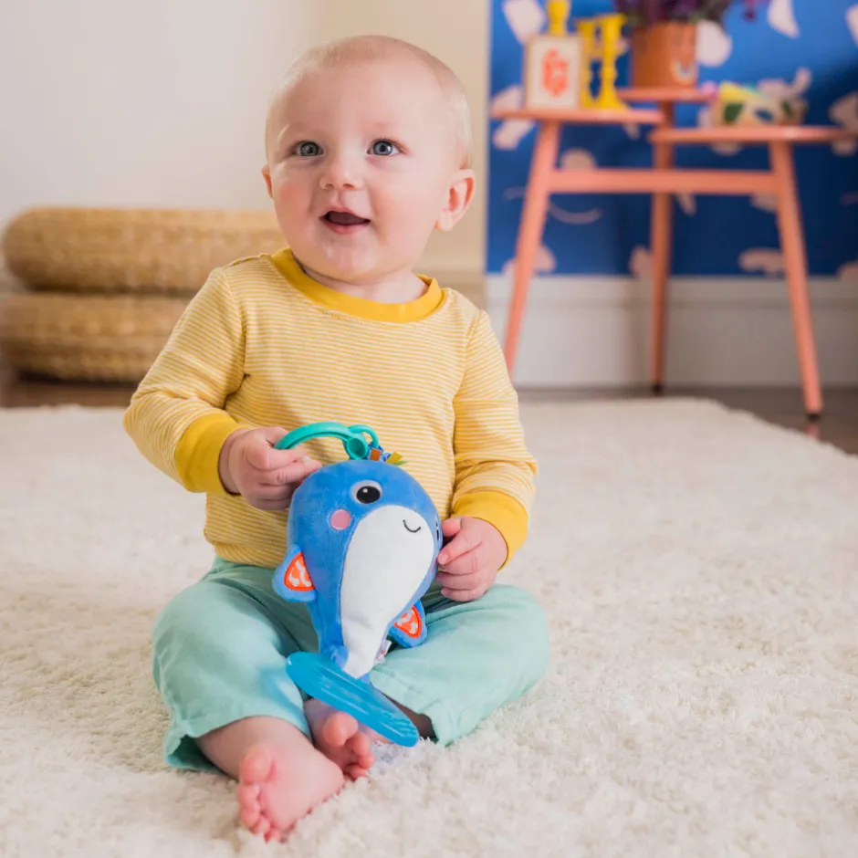 Med Whale-a-roo fra Bright Starts bliver legetiden til et hav af fjollerier. Overrask din baby med konceptet årsag og virkning ved at trække i hvalhalen for vibrationer eller ryst den for sjove klokkelyde. Udforsk de farvede bånd i klare farver og sprøde, knitrende teksturer. Plyslegetøjet er perfekt at tage med på turen og sørger for masser af aktivitet undervejs.