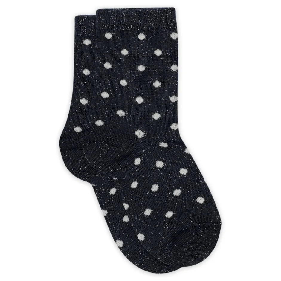 Forkæl dit barns fødder med disse elegante sokker, strikket med glitrende garn på ydersiden og blød, åndbar bomuld på indersiden for ultimativ komfort. De er designet med et stilfuldt prikket mønster og matcher perfekt med farverige hæl, tå og elastik.
