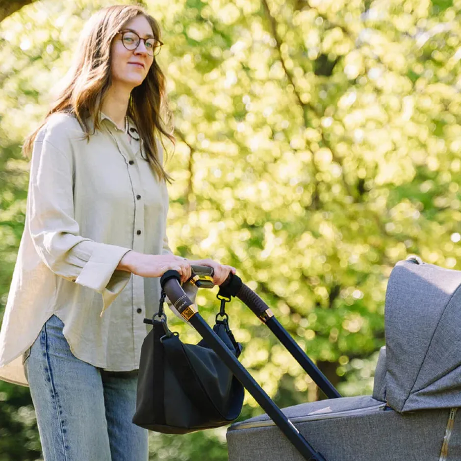 Denne barnevognstaske er en praktisk og stilfuld måde at holde orden på dine og dit barns vigtigste ting og gøre dem let tilgængelige. Den fastgøres nemt til barnevognens håndtag ved hjælp af barnevognskrogene.