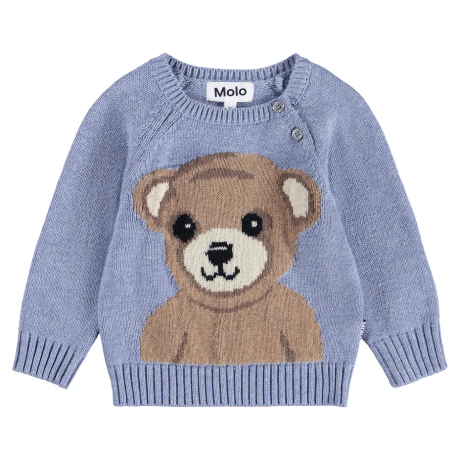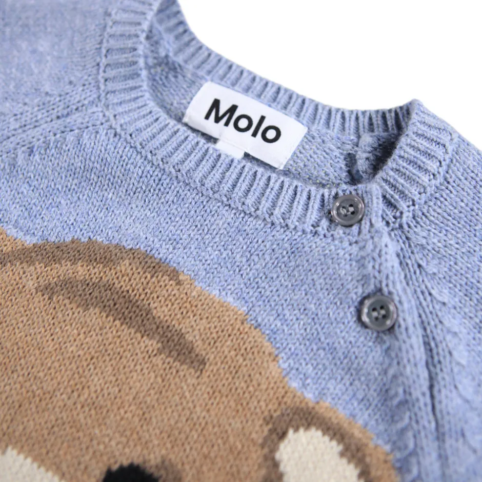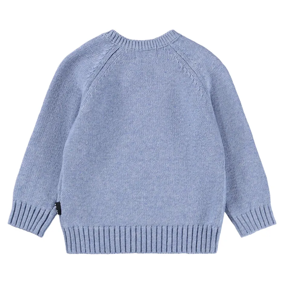 Striktrøje i en blød blanding af bomuld og uld. Modellen har rund hals, ribkanter og knaplukning ved halsudskæringen for nem påklædning.