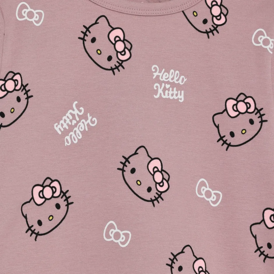 Sød bluse fra Minymo i en smuk, støvet rosa nuance, der giver et blødt og feminint udtryk. Blusen er dekoreret med et fint alloverprint af den elskede Hello Kitty-figur, som tilføjer et legende og genkendeligt look. Den har lange ærmer, en rund halsudskæring og praktiske trykknapper ved den ene skulder, som gør den nem at tage af og på. Et sødt og funktionelt valg til hverdagsgarderoben.