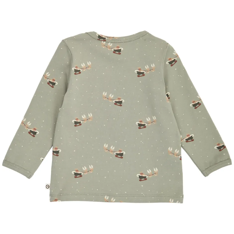 En uimodståelig bluse til juletiden! Denne søde og festlige bluse er dekoreret med et charmerende print af rensdyr og julemandens kane – perfekt til at sprede julestemning. Blusen åbnes nemt i halsudskæringen med trykknapper, hvilket gør den praktisk i hverdagen.