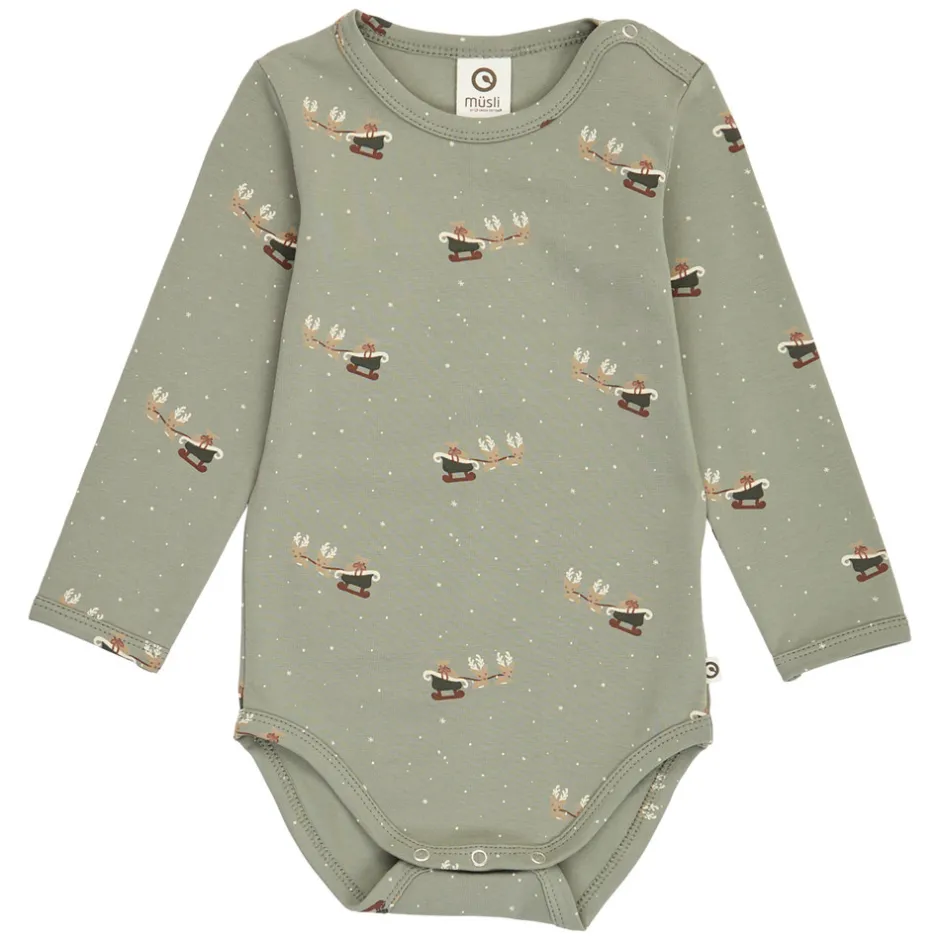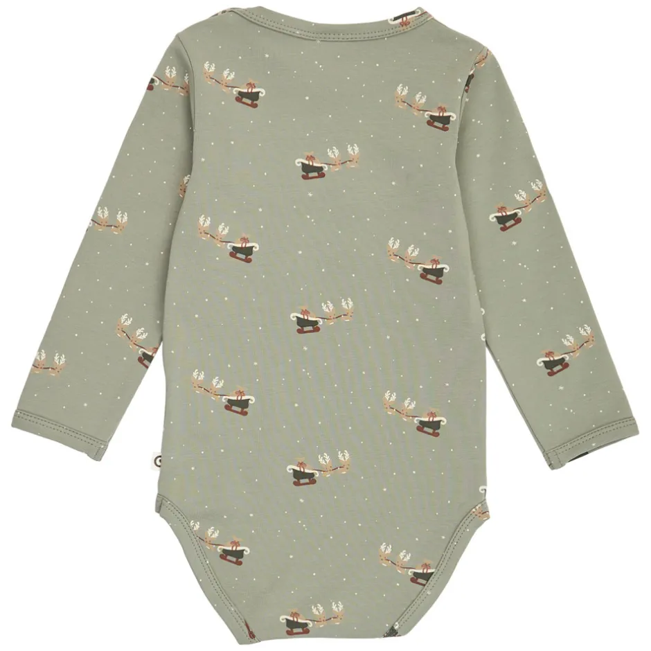 Denne søde og stemningsfulde body er dekoreret med et hyggeligt juleprint med rensdyr og julemandens kane – perfekt til at skabe julestemning for de mindste. Bodyen har praktisk trykknaplukning i både halsudskæring og bund, hvilket gør den nem at tage af og på.