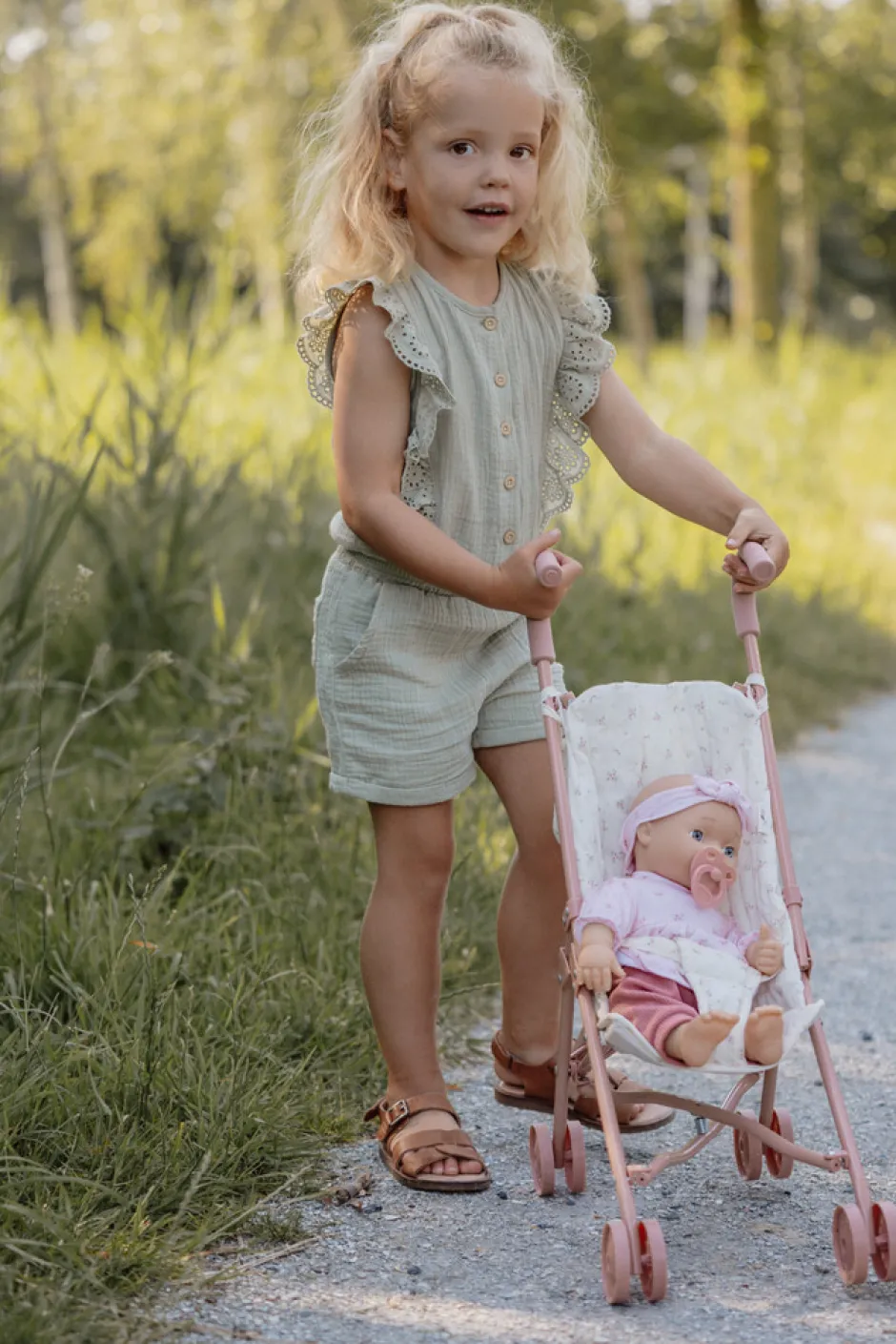 Sæt yndlingsdukke eller krammebamse i sædet, og lad klapvognen vise vej til et nyt eventyr. Sæderne er udsmykket med fortryllende design og den matchende taske på håndtagene giver plads til dukketilbehøret og andre fornødenheder til en gåtur. Stroppen holder dukken godt på plads under gåturen. Dukkevognen i metal med lyserødt stel og lyserøde håndtag og 4 lyserøde hjul er designet til at fremme fantasifuld leg og give små omsorgspersoner en følelse af ansvar. Den kan nemt foldes sammen, så den er nem at opbevare. Se hvordan dit barn med glæde skubber dukkevognen rundt, synger vuggeviser og holder pauser for at made eller trøste sin baby med en smittende følelse af ømhed og fantasi.