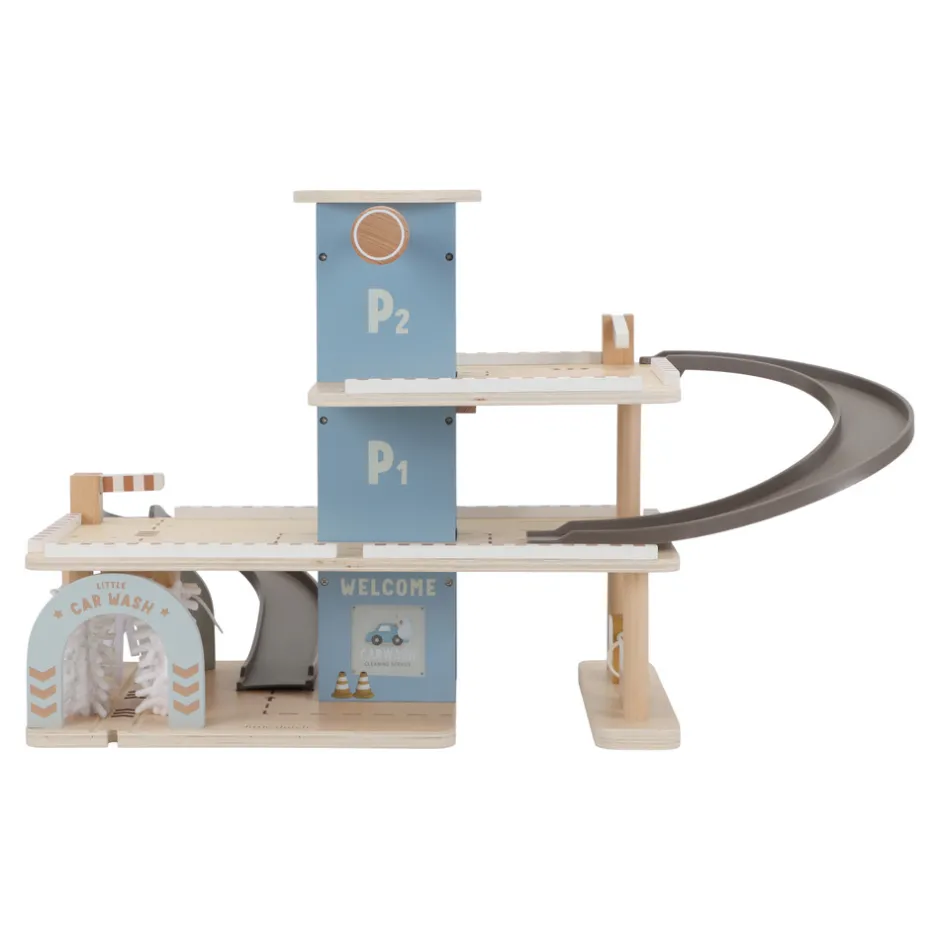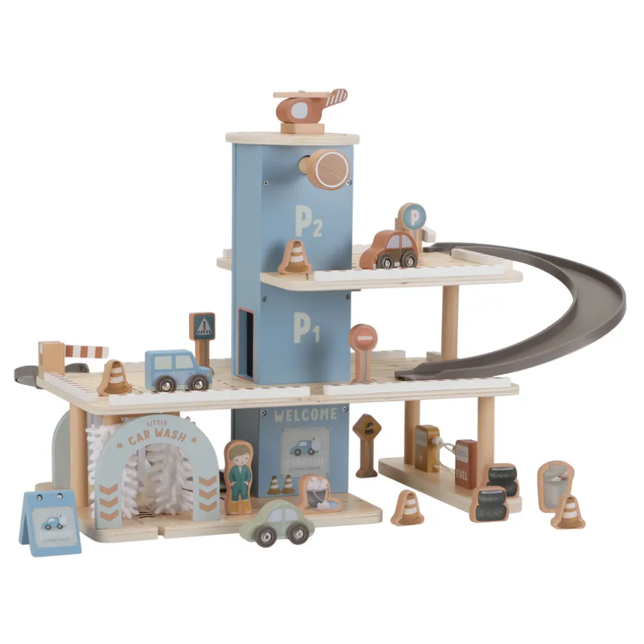 Parker, tank op og kør om kap! Denne legetøjsgarage i træ er den perfekte tilføjelse til Little Dutch Train Track XL. Garagen har en stueetage med bilvask, to parkeringsdæk og en elektrisk ladestation samt en helikopterplatform på toppen. Der medfølger trætilbehør som trafikskilte, stablede dæk og en spand. Der følger også tre køretøjer og en helikopter med. Kør op, parker din bil, eller flyv til din destination. Der er garanti for uendelig sjov!