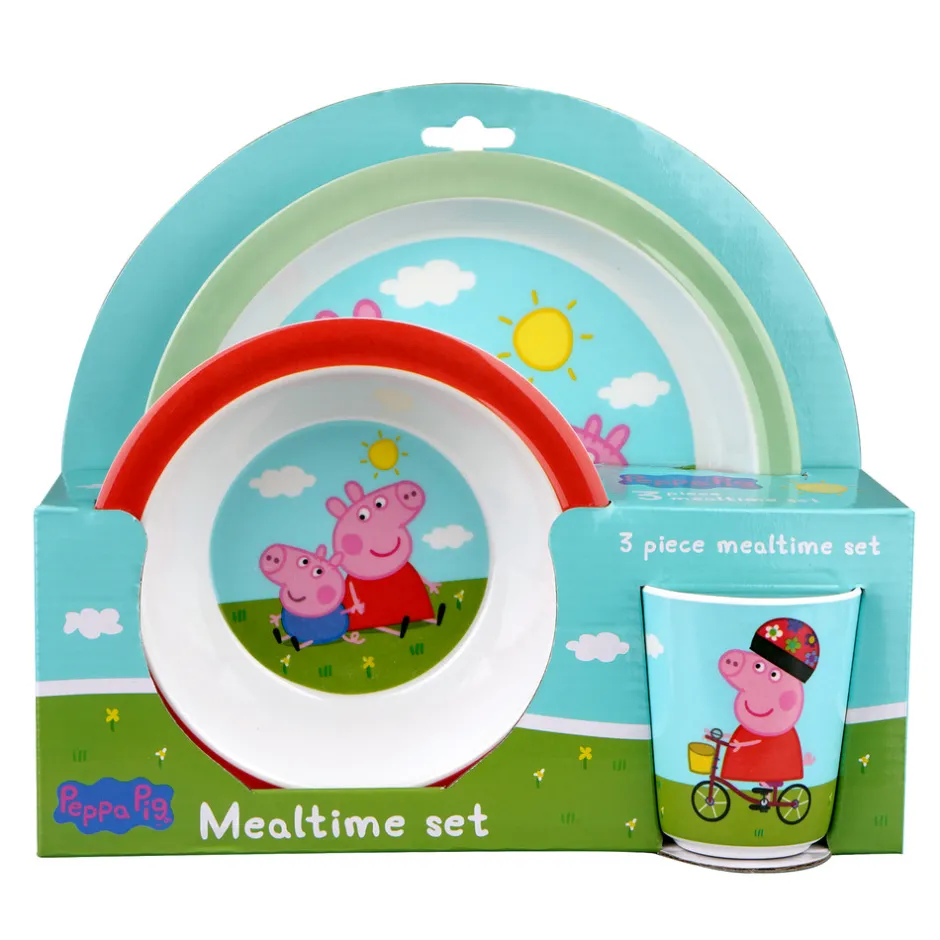 Super sødt spisesæt med detaljerede motiver fra Peppa Pig universet, der vil gøre enhver måltid sjovere. Dette spisesæt er en perfekt begyndelse, når den lille selv begynder at spise. Spisesættet giver en følelse af en fantastisk afslutning og en utrolig god kvalitet. Børn vil elske at have deres helt eget bedårende, dekorerede spisesæt med Peppa Pig.
