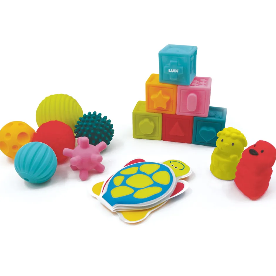 Med dette sæt er der flere forskellige muligheder for sjov leg. Alle dele er i forskellige farver, og boldene og klodserne har forskellige overflader, som er sjove for barnet at udforske. Bogen er fyldt med farverige billeder, så man sammen med barnet kan kigge på og snakke om.