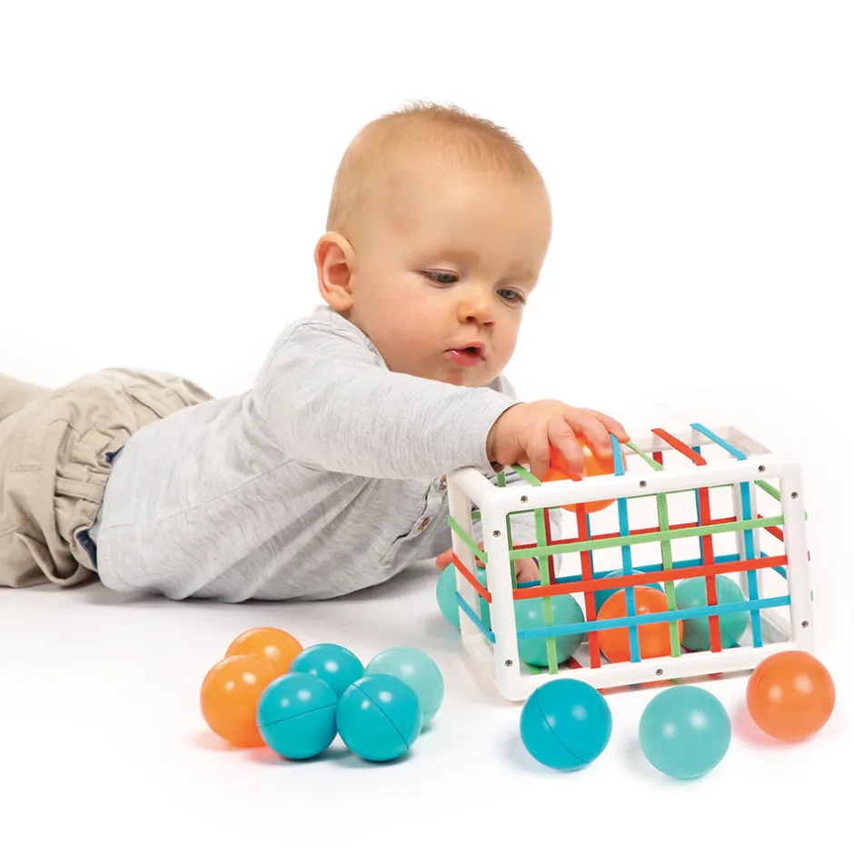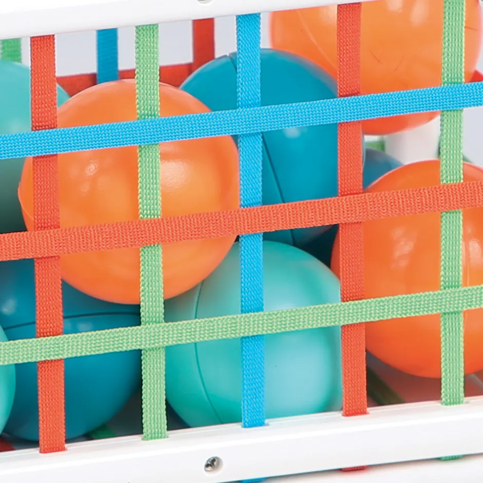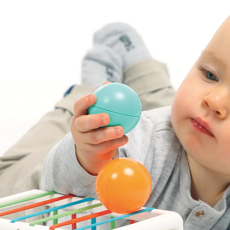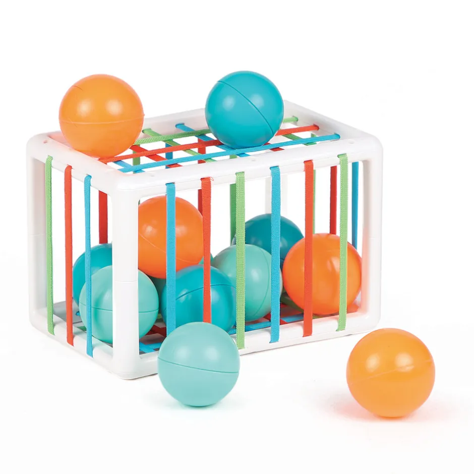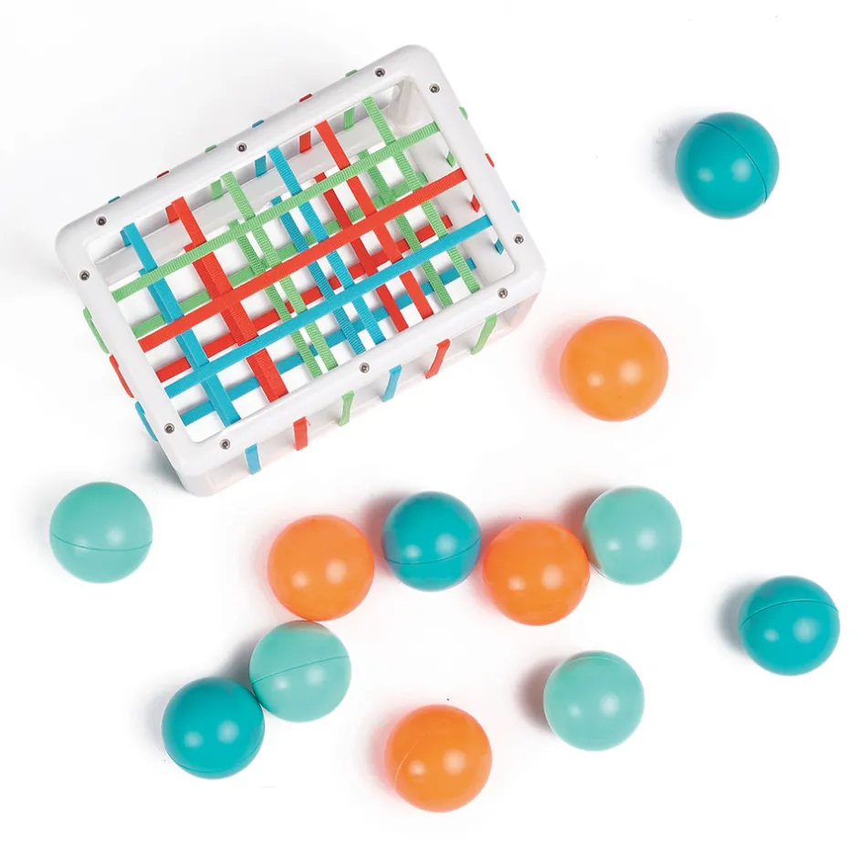 Denne motorik kasse har sider lavet af farverige strimler af elastik. Indeni kassen er der 12 små farverige bolde, hvor nogle laver en sjov lyd. Det øger barnets styrke og fingerfærdighed at skubbe kuglerne gennem strimlerne. At få dem ud igen er et spørgsmål om strategi. Mens de spiller opdager de at nogle sider slipper boldene lettere igennem. Når barnet bliver ældre kan de lære at genkende farverne og tælle kugler og elastikkerne. Udvikler logik, evnen til at forstå ting og finmotorikken.