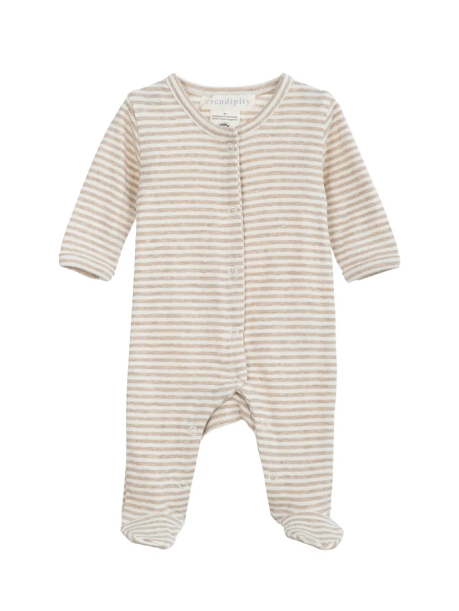 Heldragt til nyfødte i blød rib i striber. Fuld åbning foran og i ben så af- og påklædning er let. Åbnes med trykknapper. 100% blød økologisk bomuld.
