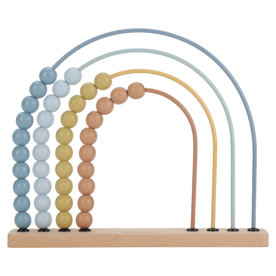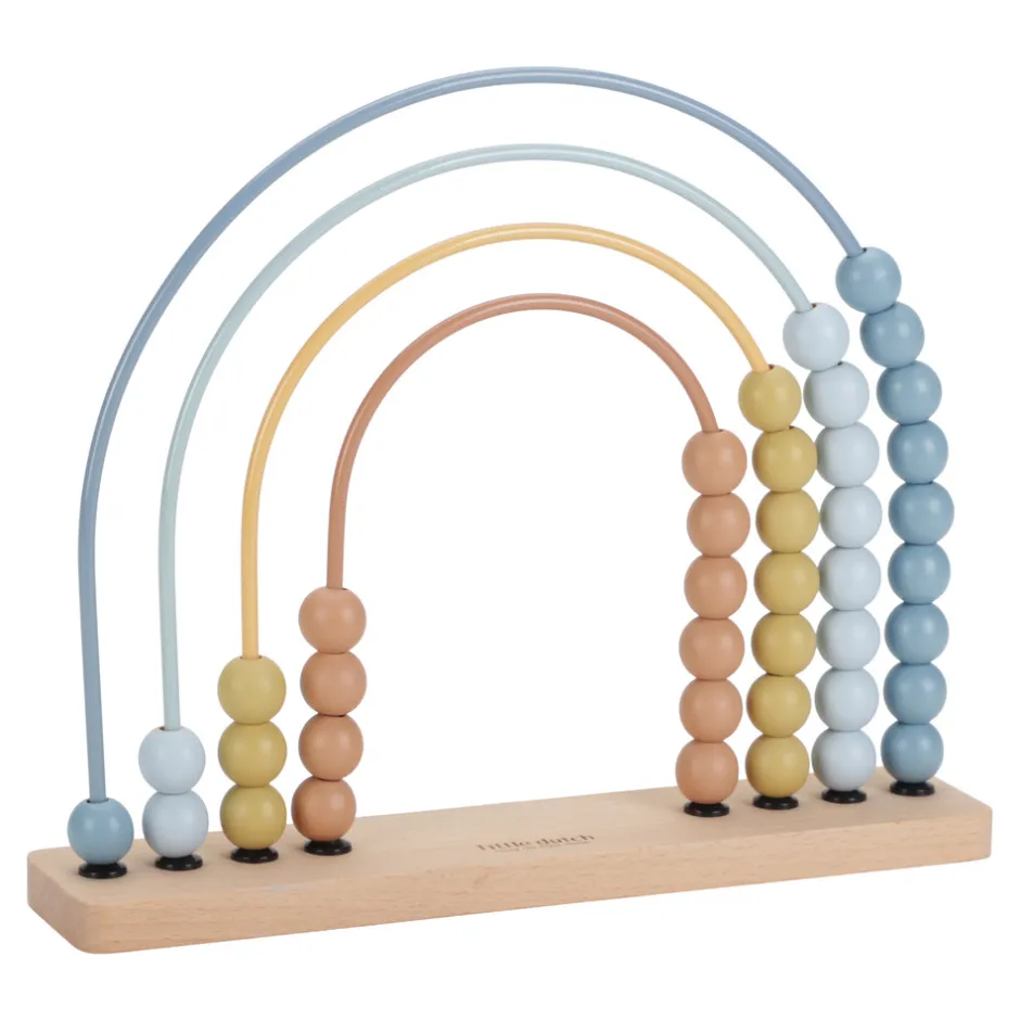 Tæl fra 1 til 10 i alle regnbuens farver! Denne yndige regnbueformede kugleramme er en dejlig måde at gøre det sjovt at tælle på. Skub de farverige perler fra den ene side til den anden, og udforsk de forskellige nuancer af blå, gul og brun. Når det lille barn leger og udvikler en grundlæggende forståelse for at tælle, trænes også finmotorikken. Større børn kan øve sig i matematik ved at lave tælleøvelser. En fantastisk måde at lege og lære på samme tid!