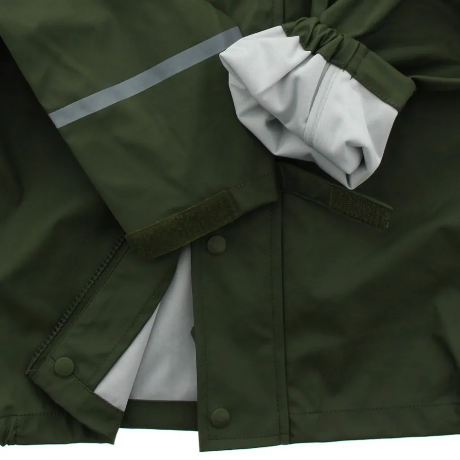 Regntøjet er i et slidstærkt materiale der klarer 5000 mm i vandsøjletryk, har tapede sømme og synlige reflekser.