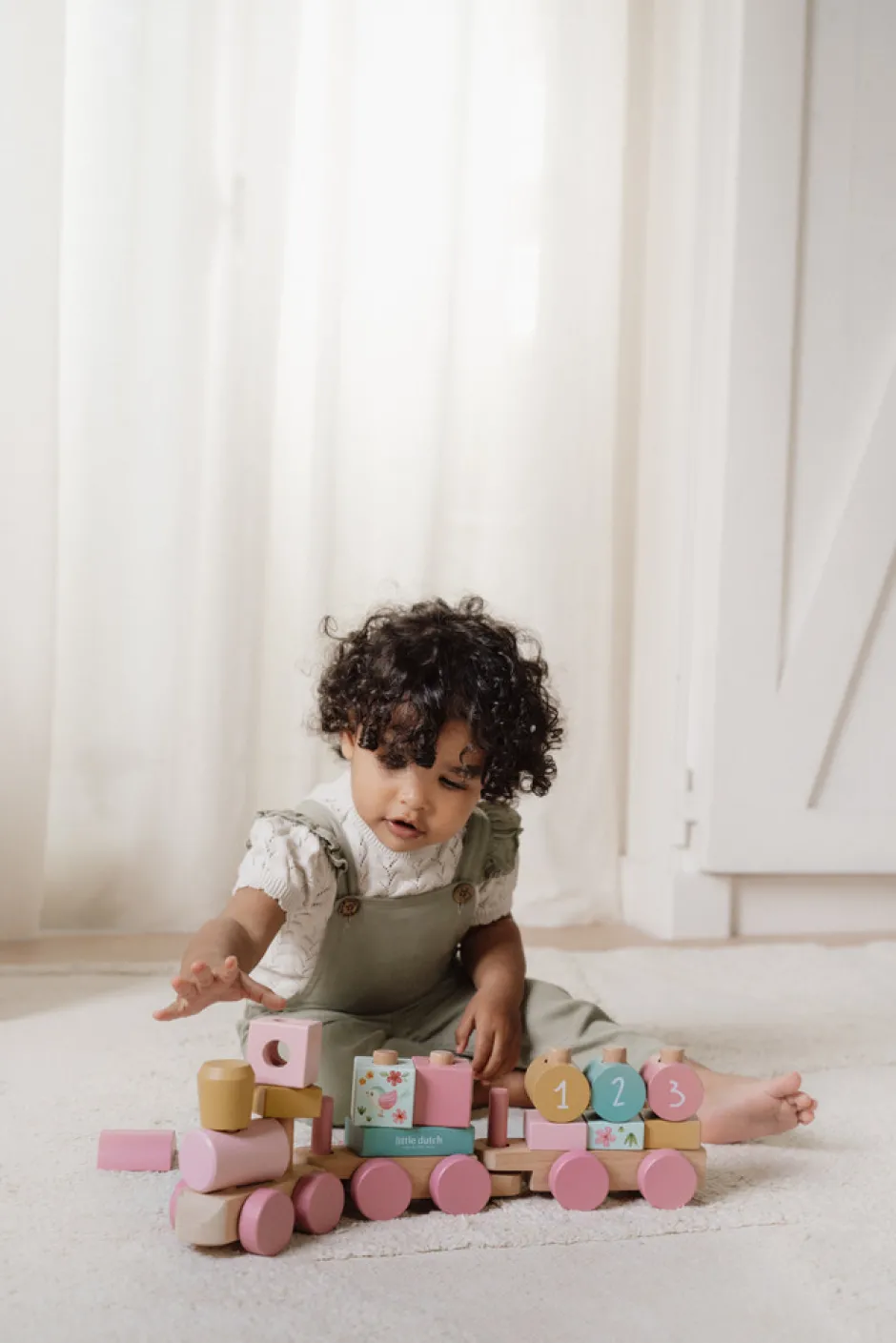 Fut Fut! Alle om bord på en magisk rejse gennem den fortryllende Fairy Garden! Stabel disse klodser en efter en og lav de tre vogne i dette smukke trætog. Farverige blomster, venlige fugle og tallene 1, 2 og 3, som pryder nogle af klodserne. En sjov måde at lege på og udvikle hånd-øje-koordination på samme tid. Toget består af 17 dele og er ca. 45 cm langt.
