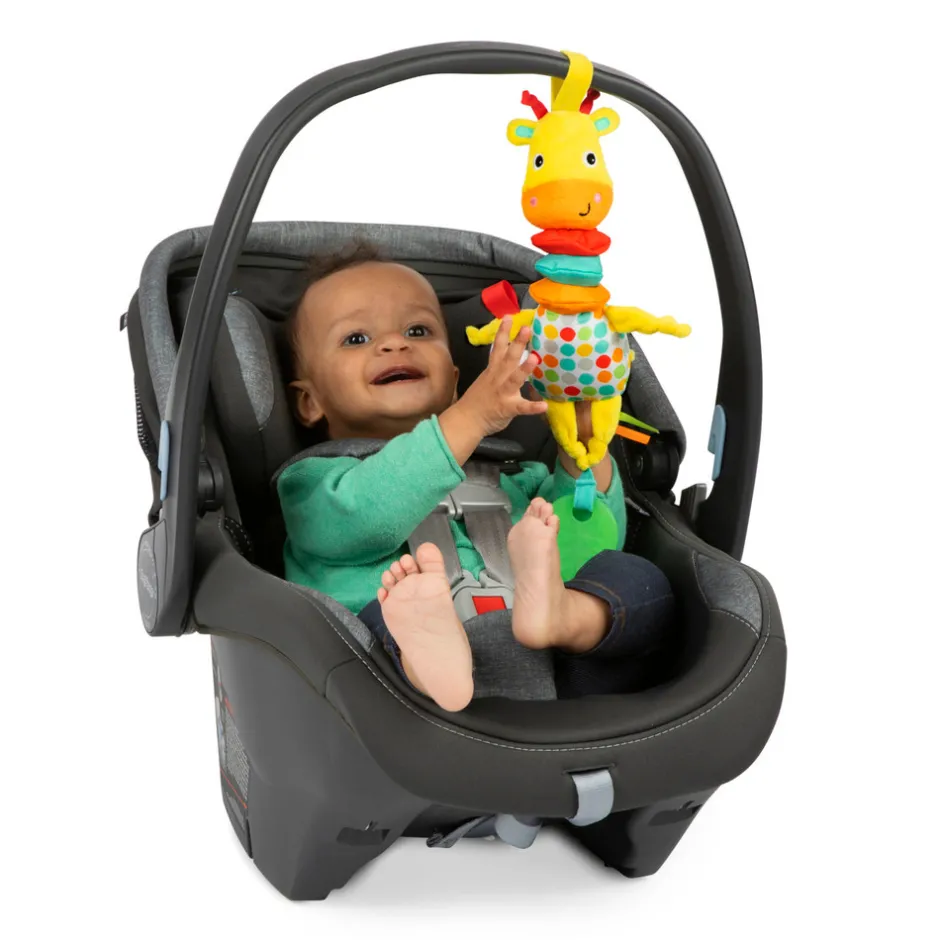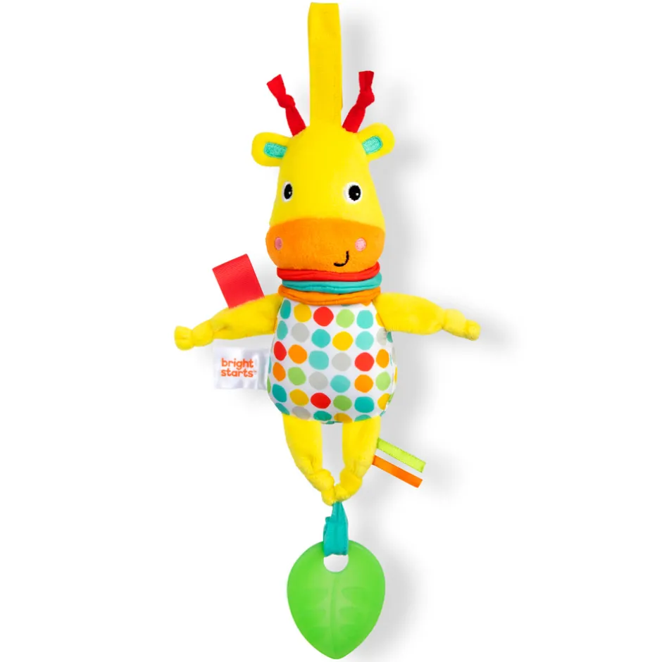 Denne smukke giraf fra Bright Starts, som kan trækkes i og leges med, vil skabe glæde hos dig og dit barn, mens I lærer og leger! Et let træk i bladet får giraffen til at strække sig. Se giraffens krop udvide og trække sig langsomt sammen i takt med 60 sekunders glade melodier. Dette musikalske legetøj fremmer udviklingen af finmotorikken, synssansen og forståelsen af princippet om årsag og virkning Dit barn vil elske de forskellige bløde materialer, der giver barnet mulighed for at udforske giraffen, samt tilbehøret i klare farver, mens du ikke vil kunne modstå de dejlige grin, som dette legetøj frembringer hos dit lille barn! Legetøjet kan nemlig nemt fastgøres til barnevognen, pusletasken og aktivitetsstativet, så din baby aldrig behøver at undvære sit yndlingslegetøj. På denne måde bliver den søde giraf hurtigt til familiens yndlingslegetøj. Mål: 12,70 cm x 27,94 cm x 5,08 cm. Legetøjet rengøres med en fugtig klud og mild sæbe og lufttørres. Produktet tåler ikke nedsænkning i vand.