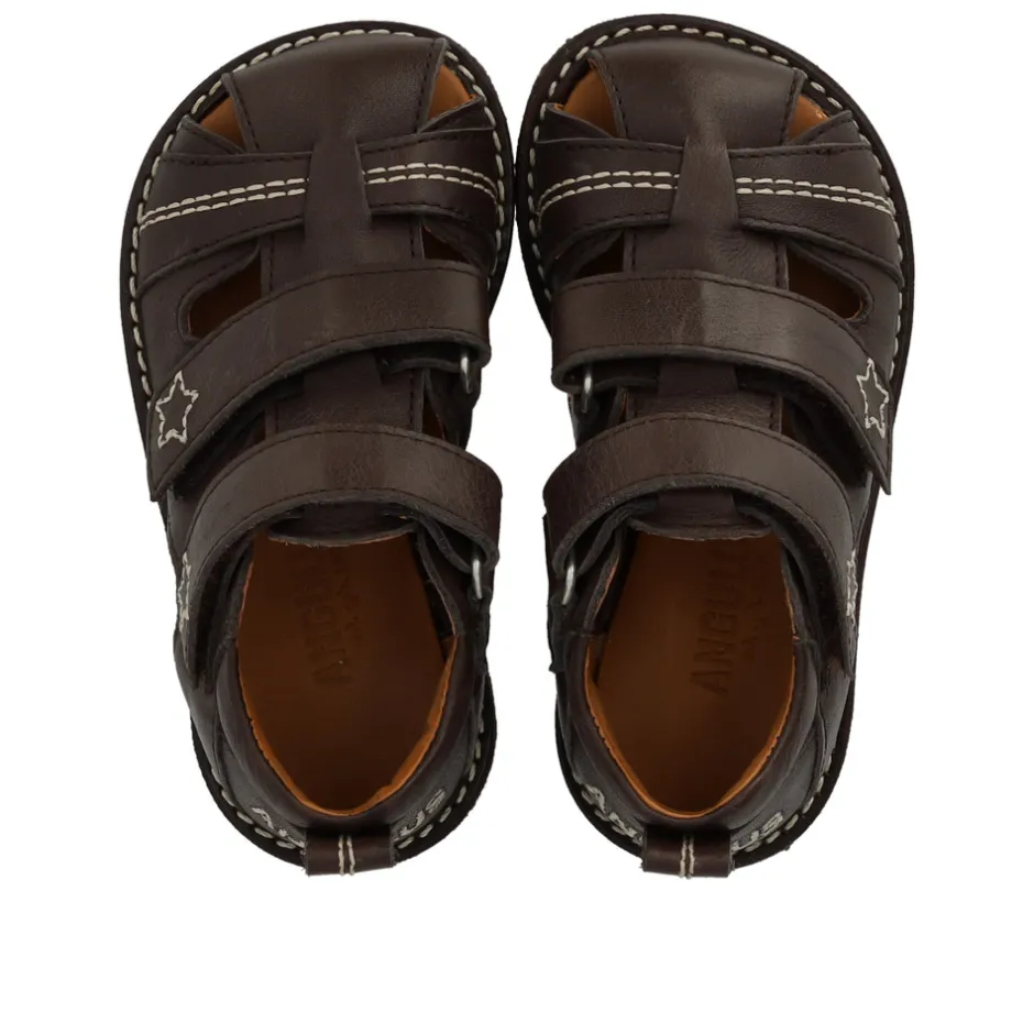 Sandalen har justerbare velcroremme som gør den særligt god til en høj vrist samt brede fødder. Sandalen har dekorative kontraststikninger, lukket tå, fast hælkappe med logobroderi og polstret krave for ekstra komfort, stabilitet og støtte, vatteret indersål, kromfrit læderfoer og en let, blød og fleksibel mørkebrun rågummisål i fornybar naturgummi.