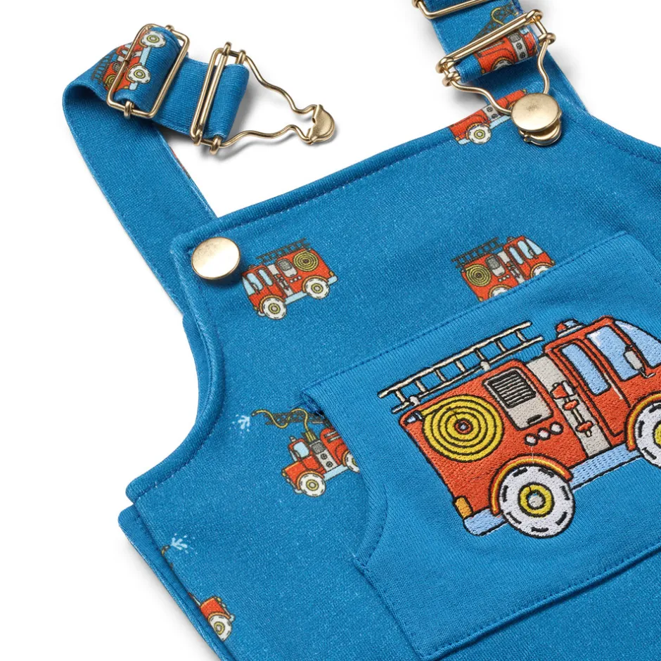 Dorset Golden Smækbukser fra Småfolk i farven Vivid blue er perfekte til små eventyrere, der elsker farver og sjove motiver. Smækbukserne er dekoreret med et charmerende brandbil-print over det hele og har en praktisk brystlomme med en broderet brandbil, som giver et ekstra legende udtryk. De justerbare seler med knapper sikrer en god pasform, mens trykknapper mellem benene gør det let at skifte ble. Bukserne er fremstillet i en blød og behagelig bomuldskvalitet, der giver masser af bevægelsesfrihed til leg og udforskning. Perfekte til både hverdag og festlige lejligheder, hvor komfort og stil går hånd i hånd.