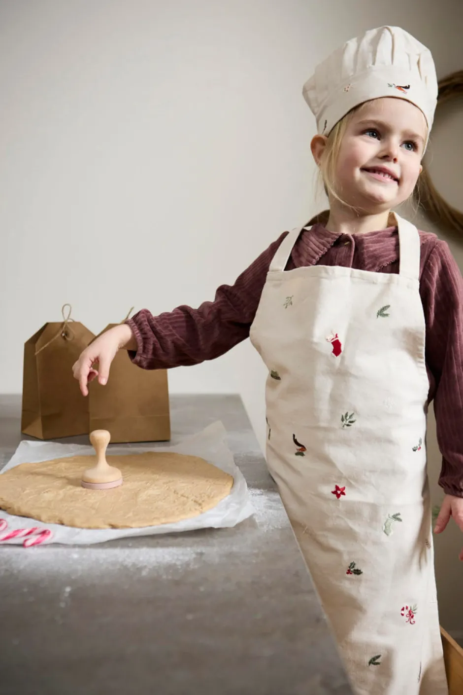 Uanset om du bager i dit legekøkken eller låner de voksnes, skaber dit eget kokkesæt af ufarvet GOTS-certificeret økologisk bomuld stor glæde. Både forklæde og hue er broderet med sirlige vintermotiver og passer perfekt til vores småkagestempel.