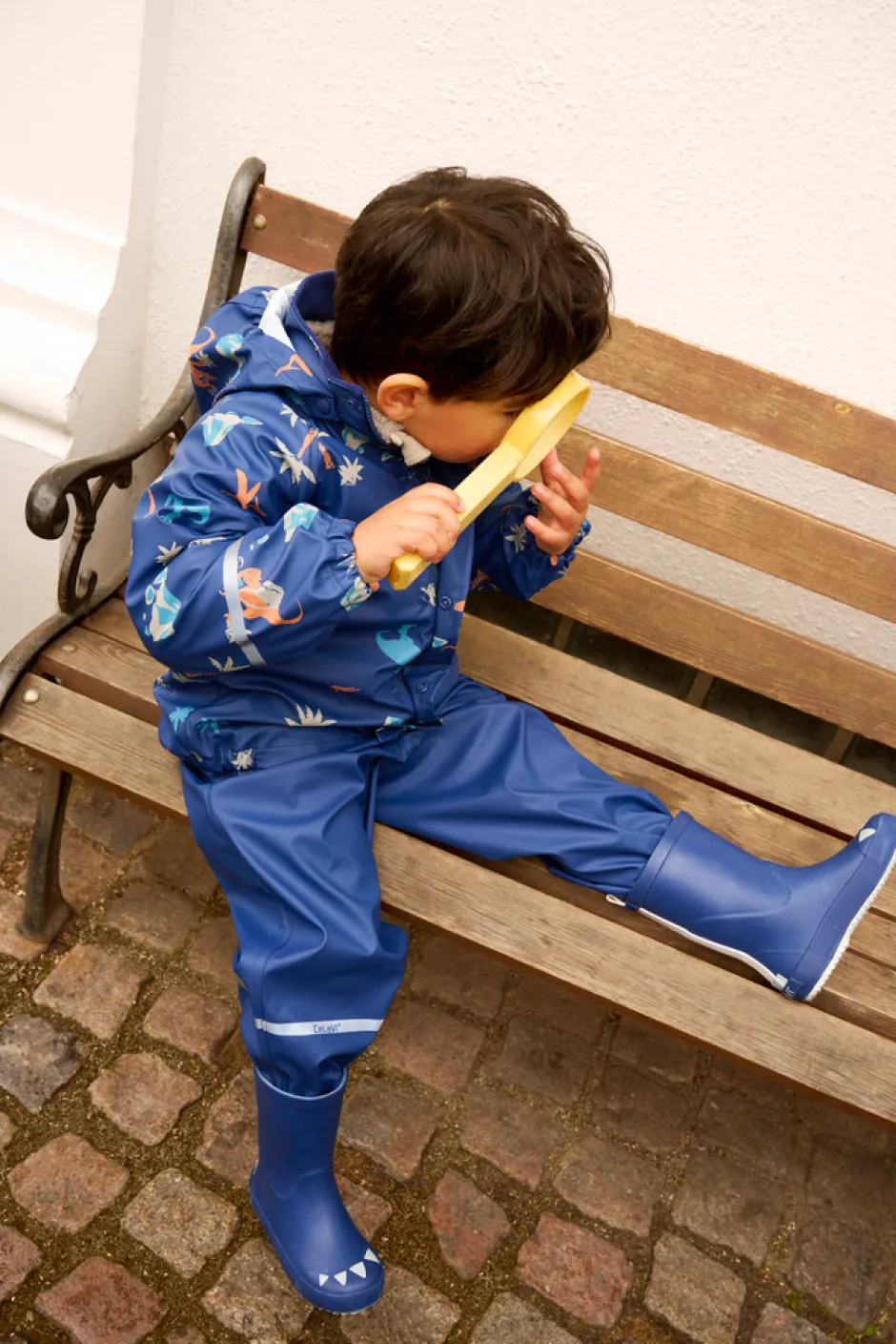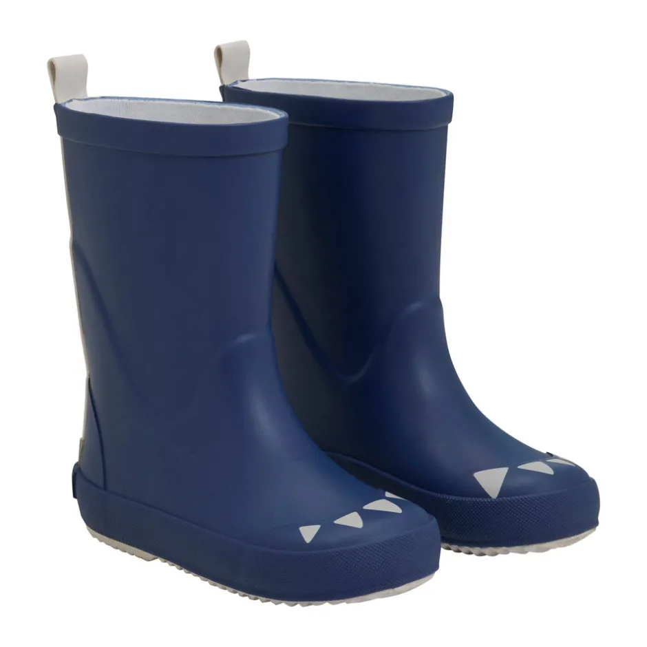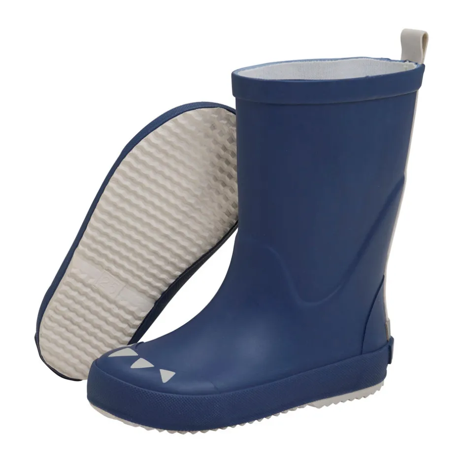 Gummistøvler med smart dino print fra CeLaVi. Gummistøvlerne er håndlavede i naturgummi og har en refleksstribe bagpå. Siden gummistøvler til børn ofte bliver brugt i flere timer af gangen, er det vigtigt for CeLaVi at de er både behagelige og funktionelle. Modellen er smallere ved hælen, så barnet bedre kan gå, løbe og lege.