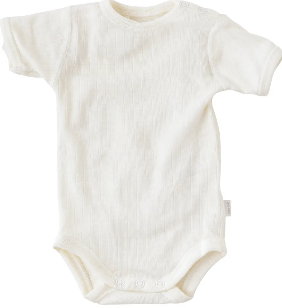Body med korte ærmer. Trykknapper på den ene skulder og mellem benene. Blød, elastisk og let uldkvalitet med lodret rille mønster. Kvalitetens strækevne gør at den er behagelig at bruge inderst. Ensfarvet. Pure merino wool og Nordic Ecolabel mærket.