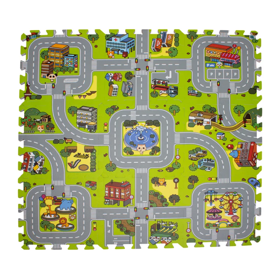 EVA-Skumgulv med motiv af vejbane og huse. Gulvet er perfekt til de helt små børn, der ligger på gulvet og leger. Når barnet bliver større er der rig mulighed for at udfolde sig kreativt. Gulvet kan danne forskellige vejruter, og her er både mulighed for at besøge zoologisk have, parken, supermarkedet eller tivoli.Indeholder: 9 stk. puslespilsbrikkerStørrelse pr. brik: 32 x 32 x 0,9 cmSamlet er det 90 x 90 cm