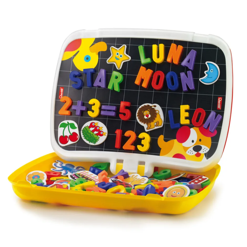 To spil i én stor multifunktionskasse: På den ene side af tavlen lærer du at læse og tælle med bogstaver og magnetiske tal, på den anden side øver du dig i at skrive og tegne med en tusch.