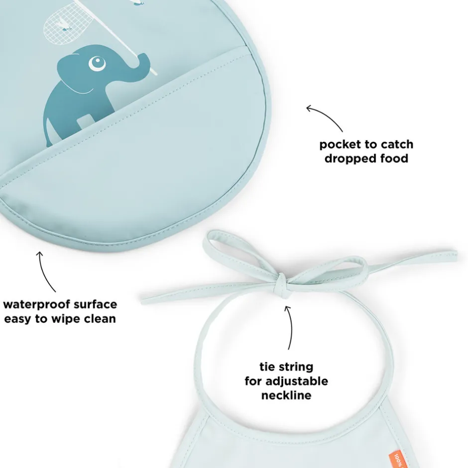 Den vandafvisende overflade beskytter tøjet mod pletter og gør rengøringen til en leg. Hagesmækkene har en smart lomme, der fanger spildt mad, så du slipper for ekstra oprydning efter måltiderne.