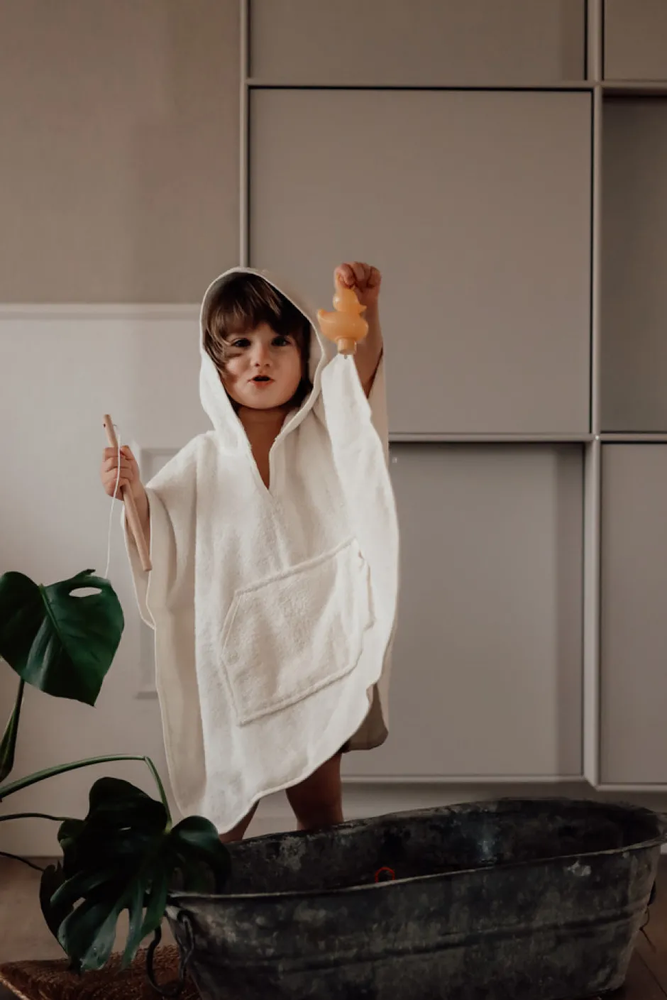 Super blød poncho med fin pom-pom og hætte i douce farve som barnet kan svøbe sig ind i. Ponchoen er i den blødeste frottébomuld med perfekt absorberingsevne fremstillet af 100% Oeko-Tex certificeret bomuld. Perfekt til efter badet, svømmehallen eller en hyggelig sommerdag på stranden.