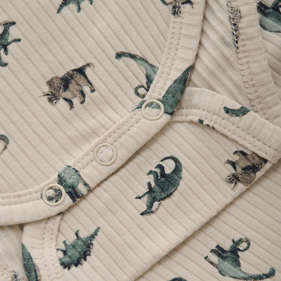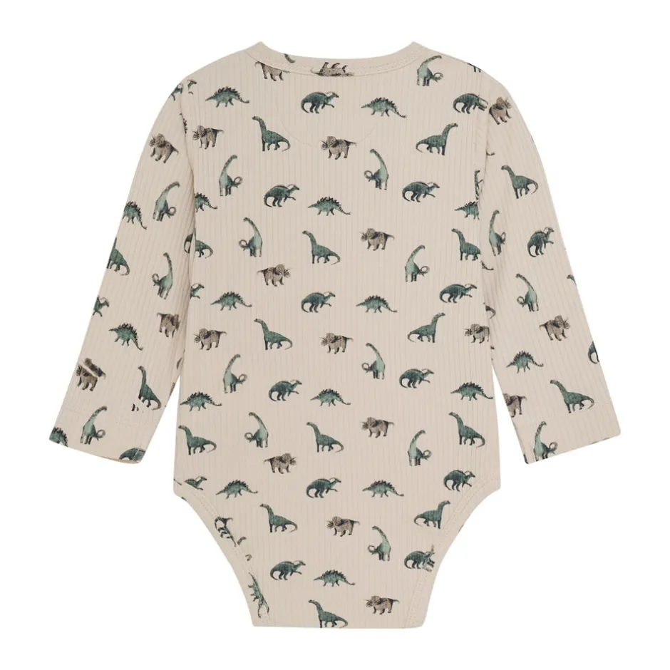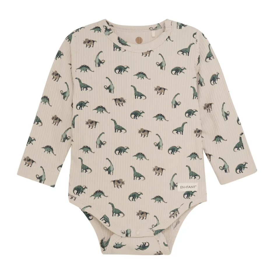 Body fra EN FANT med sejt all-over dinosaurprint. Denne body er lavet i en blød bomuldsblanding, der føles behagelig og skånsom mod huden. Den har lange ærmer, en klassisk rund halsudskæring og praktisk lukning med trykknapper mellem benene, som gør den nem at tage af og på.