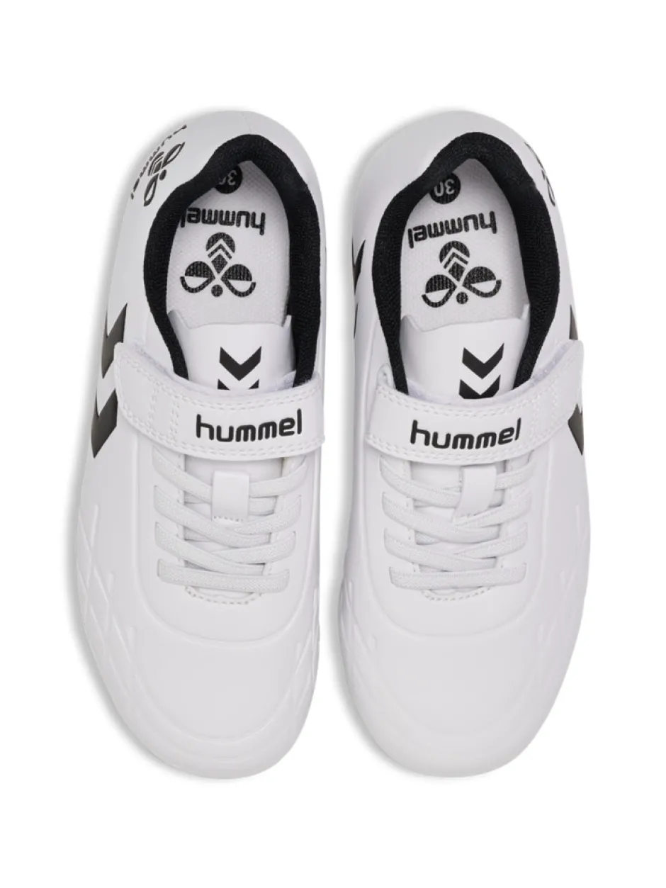 Fodboldstøvler til fast underlag. Blød kunstlæderoverdel med elastiksnørebånd og velcrolukning, blødt for i mesh og udstanset indersok. Prægninger og print på overdelen. Inspireret af hummels stolte tradition med fodboldstøvler.