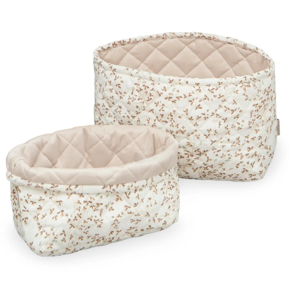 De quiltede opbevaringskurve er praktiske til organisering på puslebordet, i børneværelset eller på badeværelset. Opbevaringskurvene er lavet af OCS certificeret økologisk bomuld og har en smuk quiltning. Kanterne kan bukkes for at give kurvene et andet look, og du får 2 forskellige størrelser kurve med i sættet.