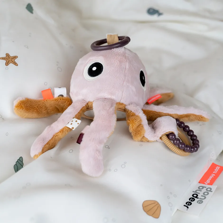 Lad nysgerrige øjne og små fingre udforske Jellys mange sensoriske muligheder. Grib fat i Jellys bløde arme, og hør dem knitre eller træk i legetøjs-ringen øverst og mærk Jelly vibrere. Lad de små opdage spejlet, der gemmer sig inde på maven af Jelly. Lad de små få lindring for kløende gummer ved at tygge på ringene, som også giver stimulerende lyde. Små fingre vil elske at udforske de farverige tags, og den søde klokke vil gøre de små nysgerrige. Brug legetøjs-ringen til at fastgøre den søde vandmand til f.eks. en barnevogn, klapvogn, bilsæde eller kravlegård – altid inden for rækkevidde for de små. Aktivitets-Jelly er blød, pudder- og mustardfarvet. En perfekt gaveide til en aktiv baby.