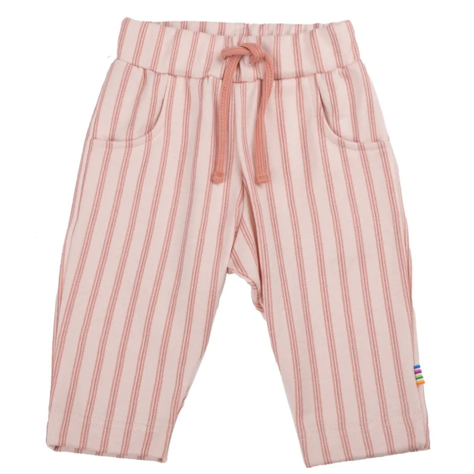 Bred elastik samt bindebånd i taljen. 2 små lommer foran som sød detalje. En blød og stabil økologisk bomuldskvalitet med tæt strikning, meget behagelig at have på. Sød stribet print.