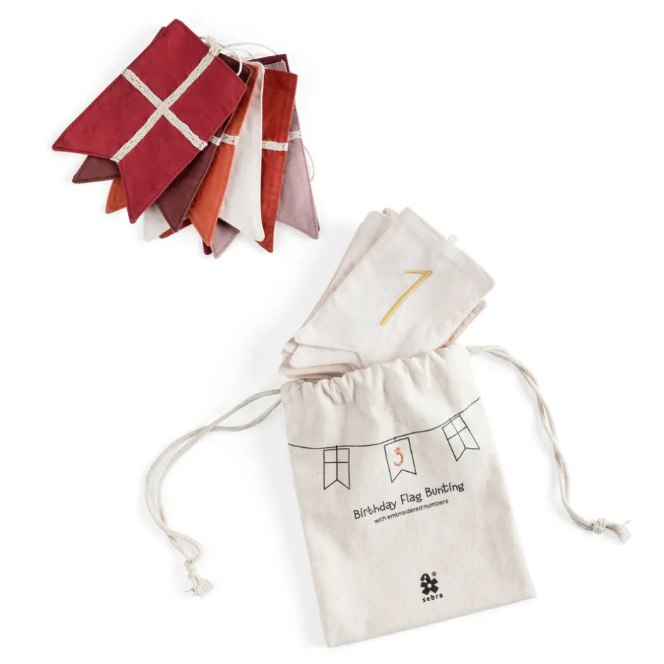 Fødselsdage er noget særligt, og den søde flagranke er perfekt til at fejre alle fødselarer i familien. Flagranken består af 6 dannebrogsflag fremstillet af økologisk bomuld i afstemte røde nuancer samt 11 flag med tallene fra 0 til 9 broderet på. Der er et ekstra 1-tal i den medfølgende opbevaringspose, så 11-års fødselsdagen også kan fejres. Skab en mindeværdig tradition ved at hænge flagranken op til alle familiens fødselsdage og brug den fine opbevaringspose til at gemme ranken i imellem højtiderne. Flagranken er en del af Sebras 20-års fødselsdagskollektion, der også består af et bordflag og et fødselsdagstog med lys og udskiftelige tal. Den er designet i Danmark, og en skøn barsels- eller dåbsgave, der kan bringe glæde i mange år.