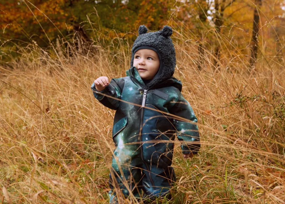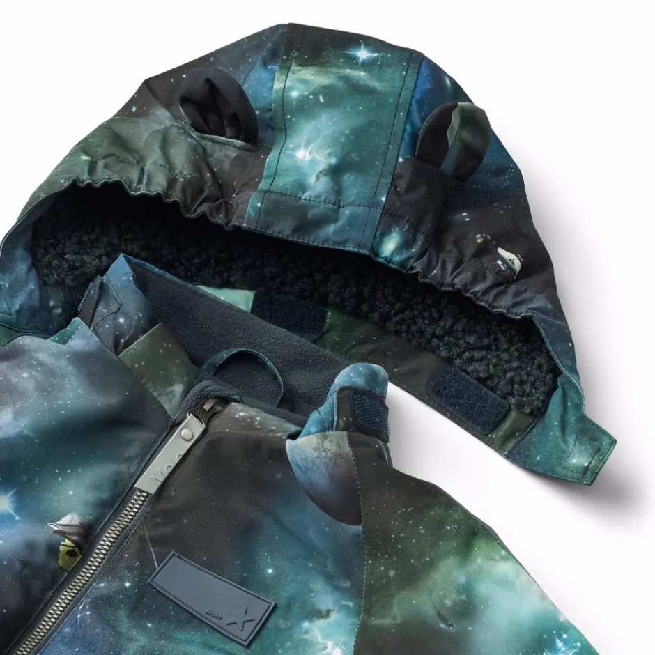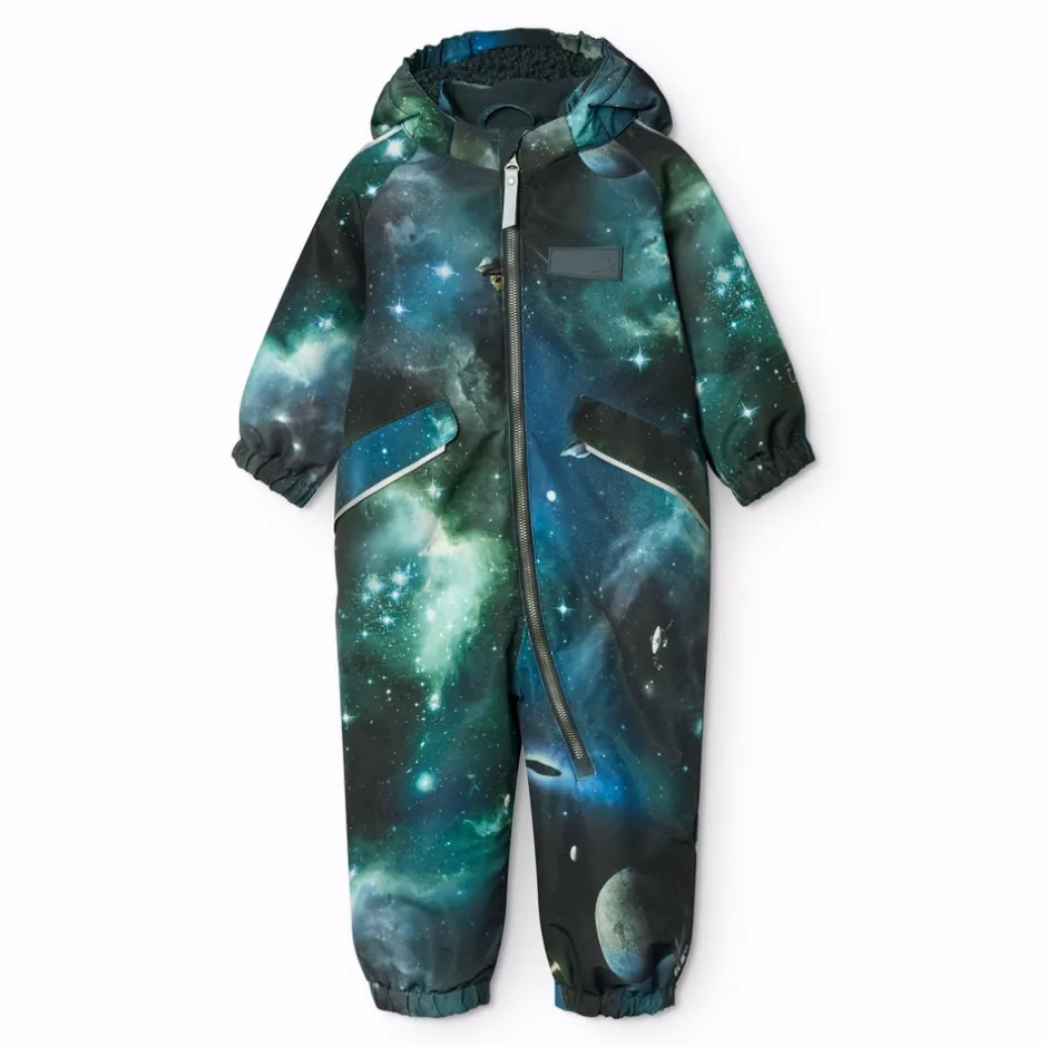 Vandafvisende flyverdragt til de mindste, fremstillet i genanvendt nylon. Dragten har en aftagelig, foret hætte og en ekstra lang lynlås på fronten, der gør den nem at tage på og af. Elastikken i lænden samt ved ærme- og ben afslutninger sørger for, at sne, regn og vind holdes ude, samtidig med at luffer og støvler bliver på plads. Flyverdragten er udstyret med refleksbånd på lommerne og ærmerne, som sikrer ekstra synlighed i trafikken. Derudover har dragten fleecefor ved numse og ryg samt en indvendig justerbar elastik i taljen, der giver en tæt og behagelig pasform omkring kroppen.