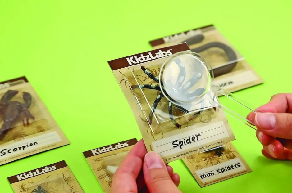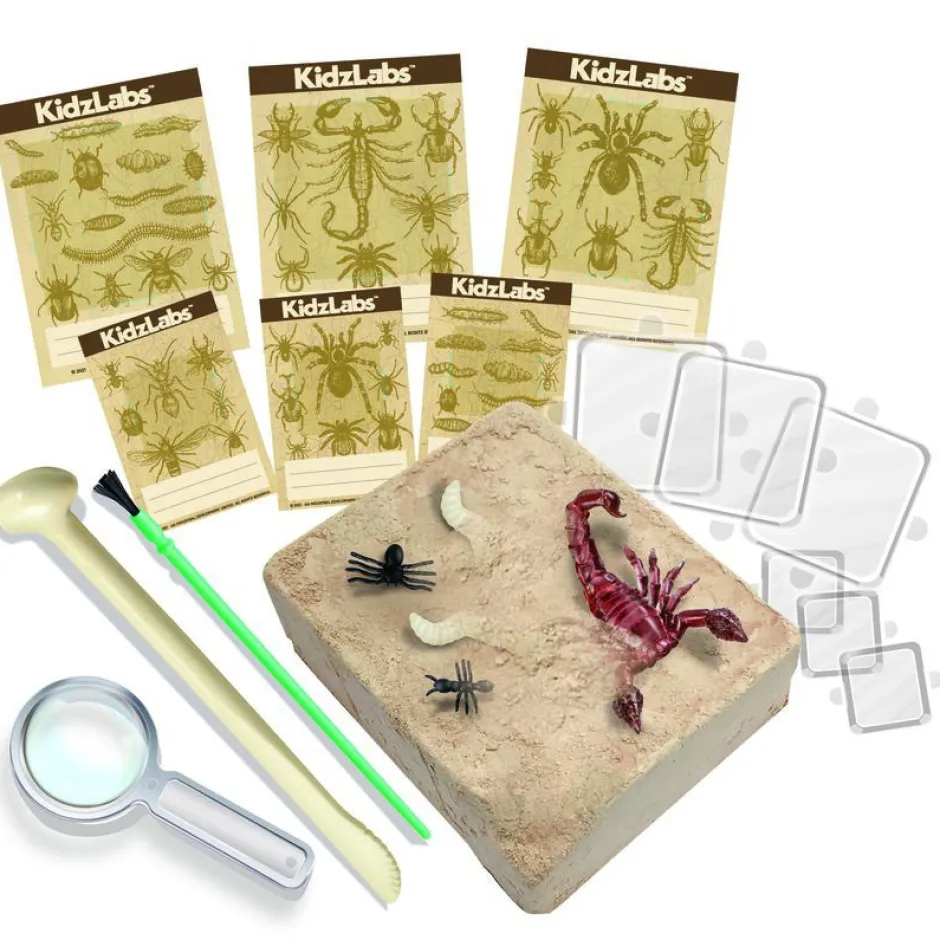 Udgrav disse uhyggelige og ulækre insekter. Sæt dem på prøvekortene og lær nogle interessante facts. Det er et sejt videnskabssæt.