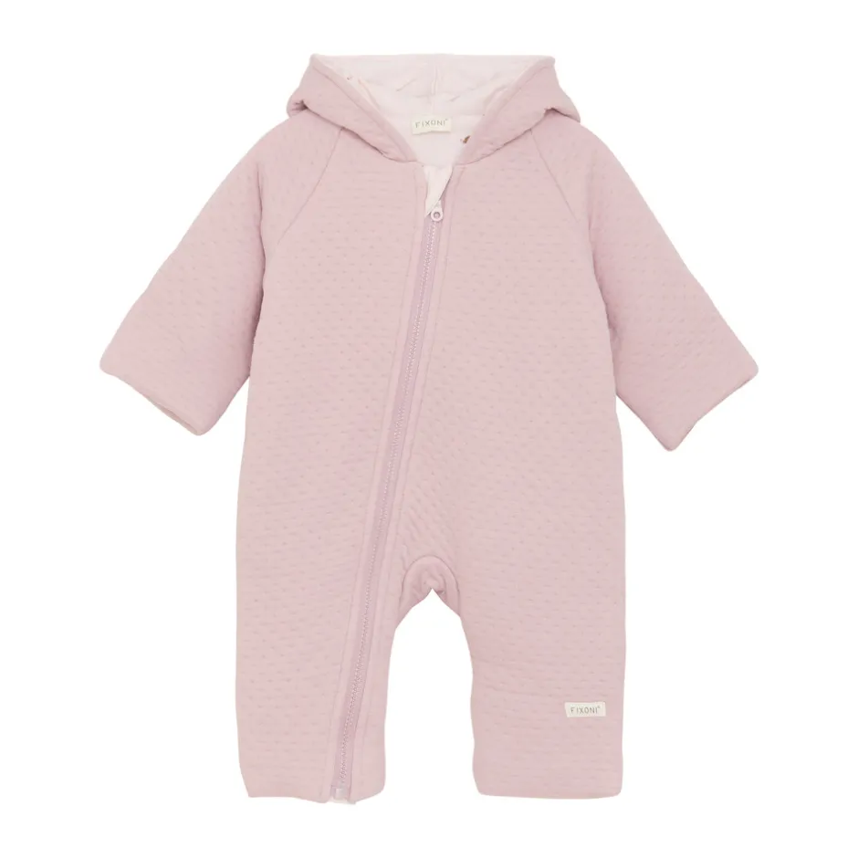Blød køredragt fra FIXONI i ensfarvet design med sødt printet foer. Dragten har en praktisk lynlås, der går fra midten og skråt ned til højre ben, hvilket gør den nem at tage af og på. Den er designet med fast hætte samt foldbare fødder og luffer, som giver ekstra varme og fleksibilitet.