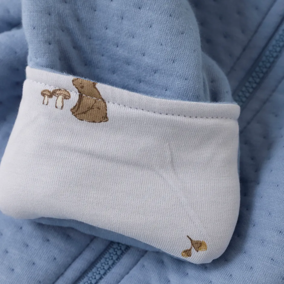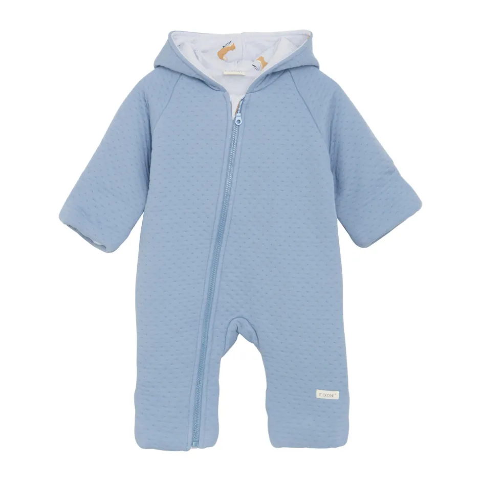 Blød køredragt fra FIXONI i ensfarvet design med sødt printet foer. Dragten har en praktisk lynlås, der går fra midten og skråt ned til højre ben, hvilket gør den nem at tage af og på. Den er designet med fast hætte samt foldbare fødder og luffer, som giver ekstra varme og fleksibilitet.