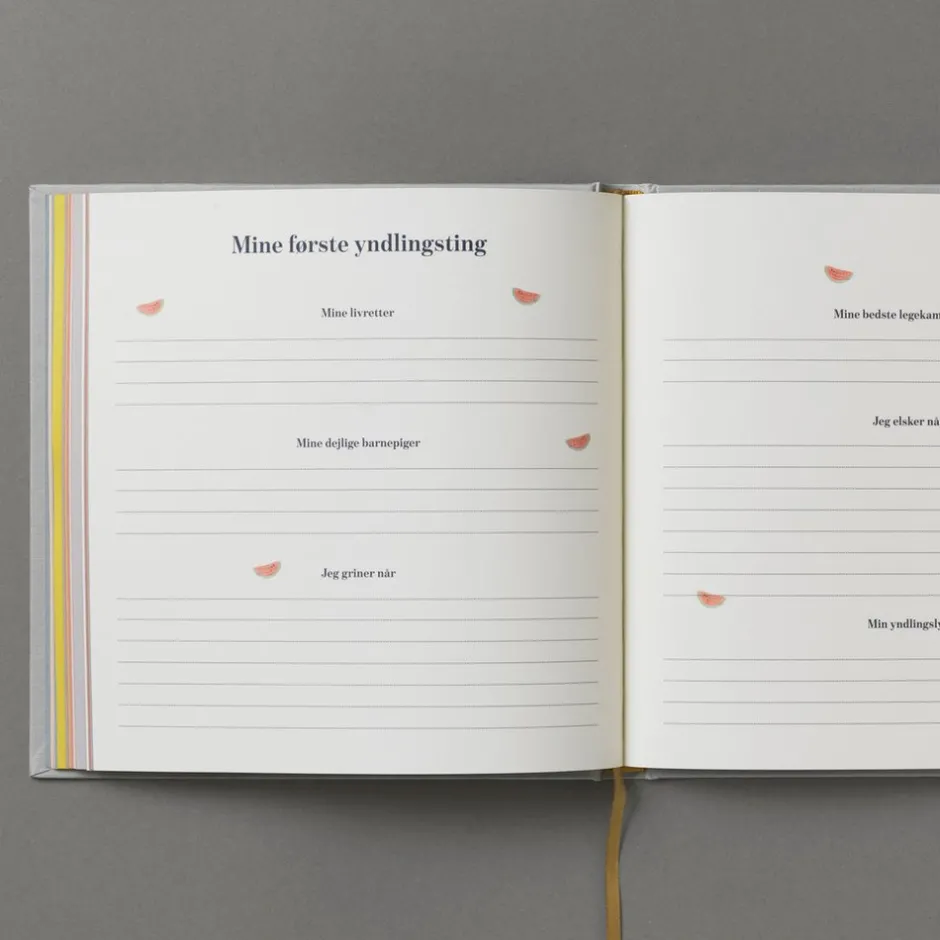 En unik scrapbog hvori forældrene kan dokumentere barnets første tid, lige fra tilblivelsen inde i mors mave og til barnets første ord, yndlingsminder etc. Bogen bliver på denne måde en værdsat skattekiste af historier og billeder der kan tages frem over årenes løb og læses med barnet. Børn elsker nemlig at høre deres egen historie og få sat ord på deres identitet. Bogen er også ideel som dåbsgave.