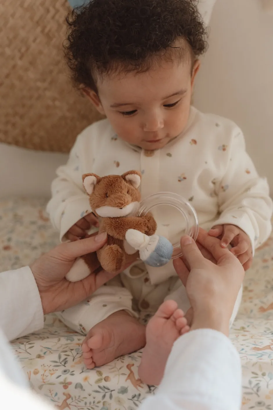 Grib, drej og ryst! Ringranglen med ræven, som med sin bløde pels og lille hale er designet til at stimulere din babys nysgerrighed. Den gennemsigtige ring indeholder 3 farverige små perler, som rasler, når din lille leger med den. Ikke alene vækker Ringranglen forbedrer også hånd-øje-koordinationen.