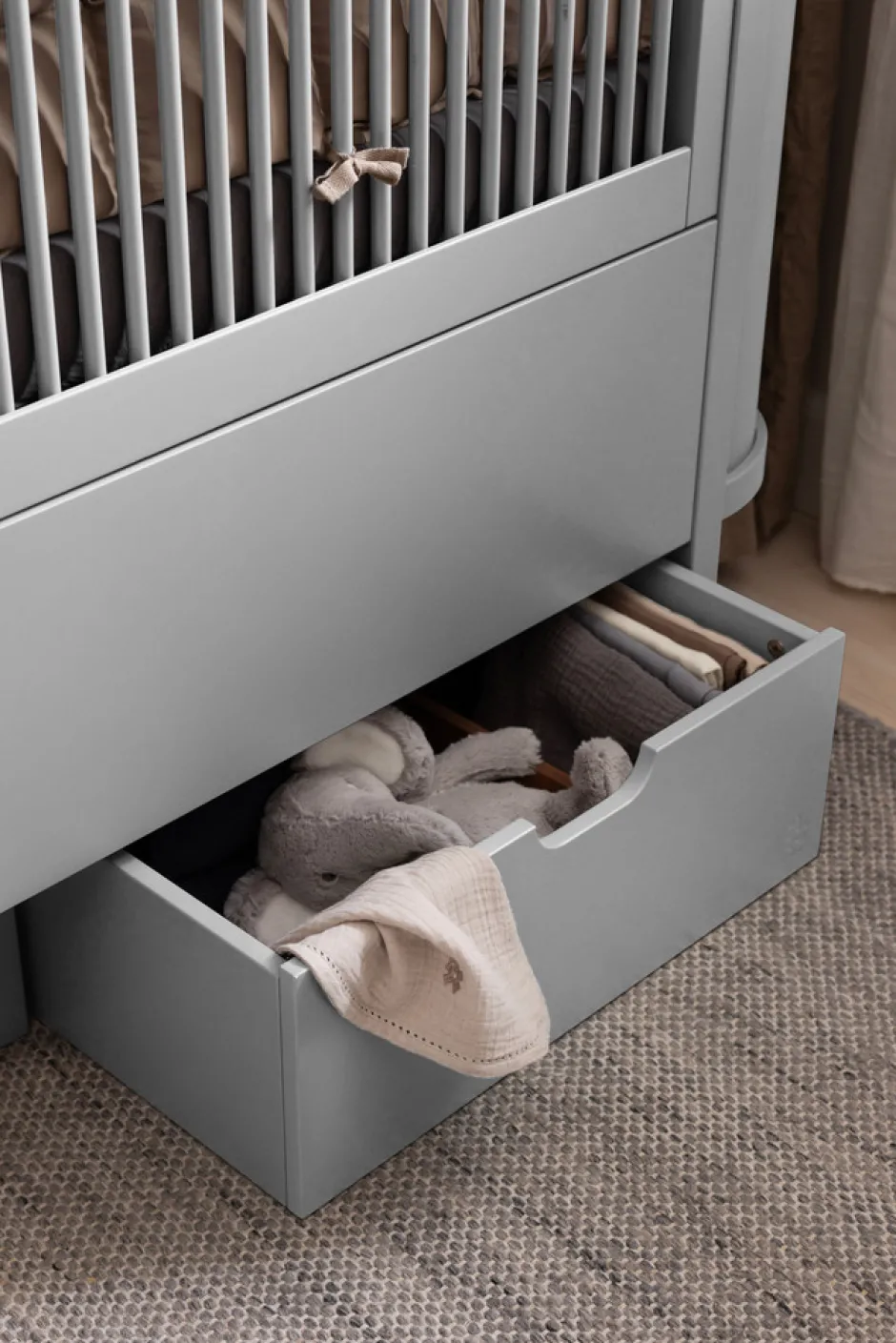 Sebra Sengeskuffen, Baby & Jr. passer til Sebra Sengen, Baby & Jr. Sebra Sengeskuffen, Baby & Jr. er udstyret med hjul, så den er let at skubbe ind under og trække ud fra sengen. Et afrundet, udskåret håndtag midt på skuffen gør den samtidig nem at tage fat i. Når Sebra Sengen, Baby & Jr. er trukket ud som juniorseng, kan der være to skuffer under sengen. Brug Sebra Sengeskuffen til opbevaring af legetøj, sengetøj, tøj eller hvad der nu måtte være behov for. Møblet kommer usamlet og samles let ved at følge den tilhørende samlevejledning.