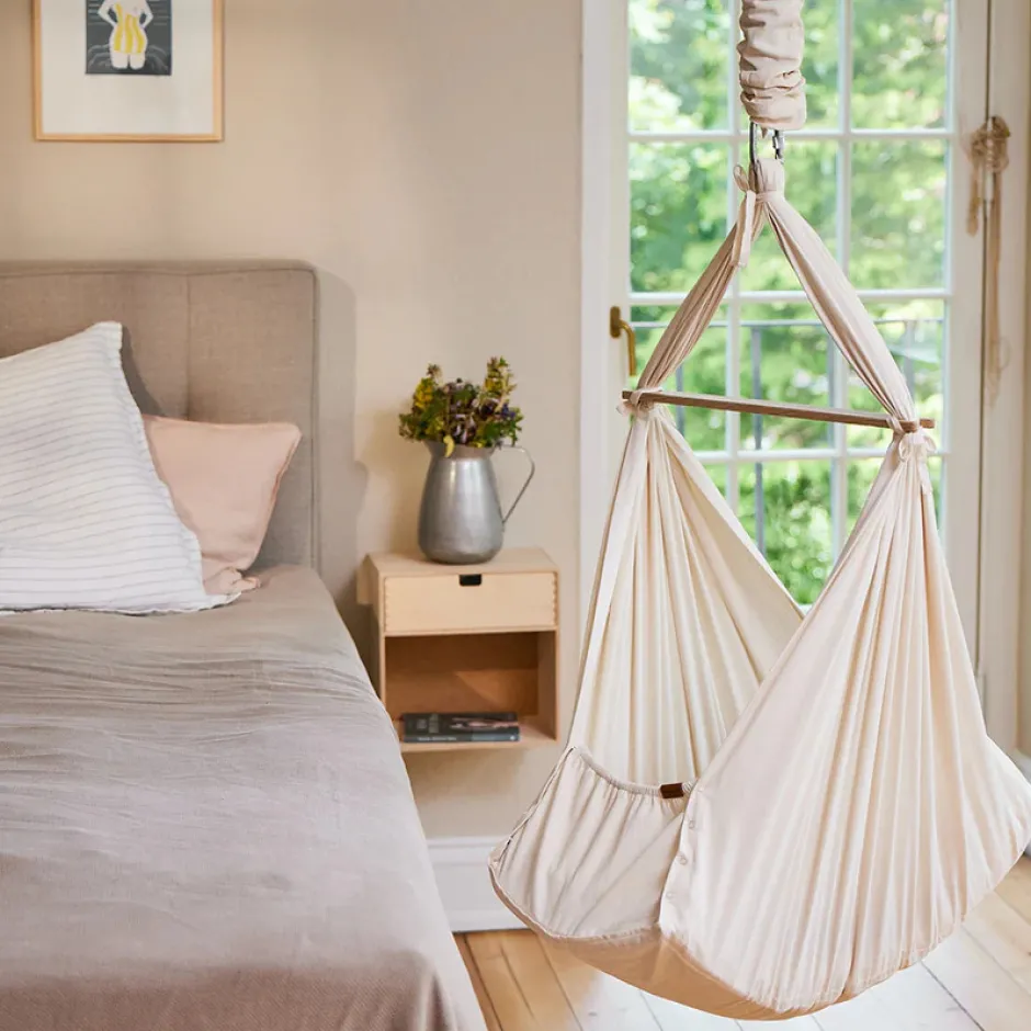 Blød og slidstærk slyngevugge i 100% økologisk bomuld, hvor der medfølger en blød madrads med polyester fyld. Slyngevuggen efterligner forældrenes trygge favn og bløde bevægelser og former sig om barnets krop. Den er perfekt til urolige babyer eller babyer, der sover relativt korte lure. Du kan placere den stort set, hvor du ønsker det, og du kan endda tage den med til bedsteforældre, venner eller i mødregruppen – blot du har det rette tilbehør. Slyngevuggen kommer i en økologisk bomuldsstofpose, som gøre den nem at transportere. Yderligere medfølger der en fjedre med sikkerhedsstrop og en tværpind i ubehandlet bøgetræ, som giver et skandinavisk udtryk.