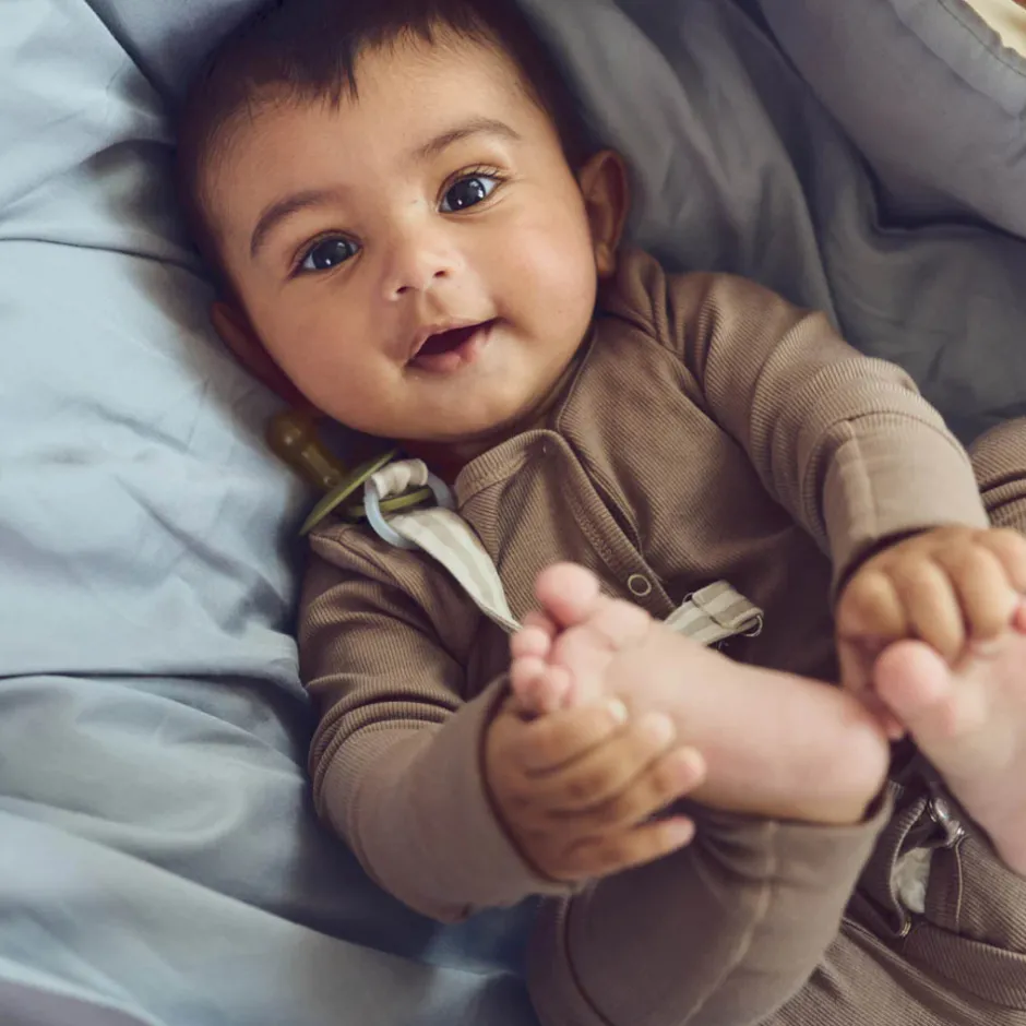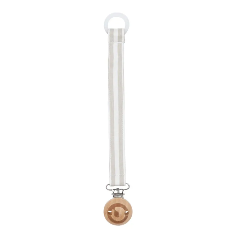 Praktisk suttesnor i lækkert stof. Suttesnoren har en metalklips med træ ovenpå så man kan påsætte snoren på trøjen så sutten ikke bliver væk. På enden af suttesnoren sidder der en gummiring som kan holde på flere forskellige slags sutter.