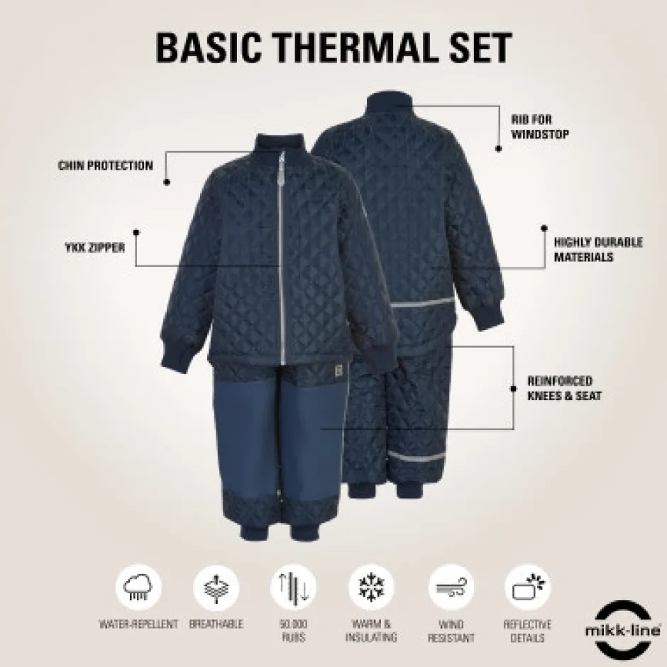 Lækkert og blødt termosæt fra mikk-line – det perfekte valg for aktive børn. Termosættet er vandafvisende og har både reflekslogo og refleksbånd, der sørger for, at dit barn kan ses i mørke. Forstærkninger på knæ og bag gør bukserne ekstra slidstærke.