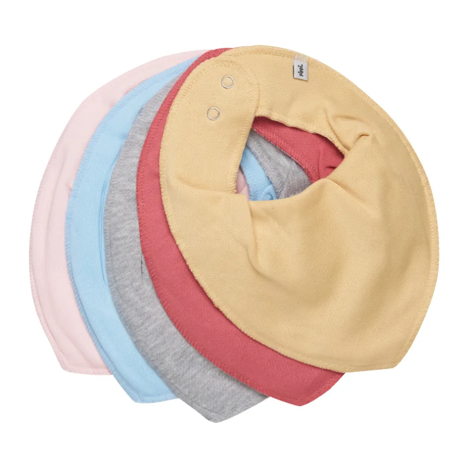 Ensfarvede tørklæde savlesmæk i fine farver som 5-pak i økologisk bomuld og polyester. Smækken består af to lag stof med en membran i midten, der gør dem 100% savletæt. Blødt materiale, som er behagelig for barnet at have på og 2 trykknapper i nakken.
