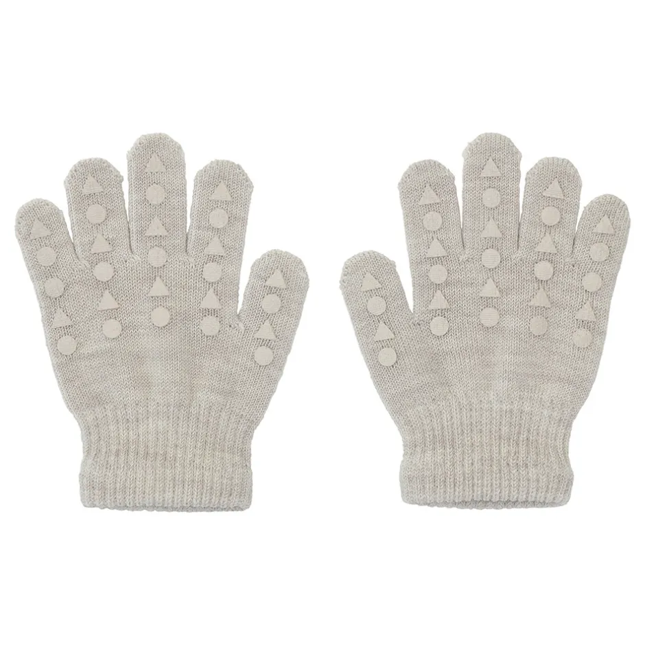 GoBabyGo fingervanter i uld med gummidutter på indersiden af fingrene som gør det lettere at lege, gribe and holde fast på ting når barnet leger udendørs. Slip fingrene løs og styrk barnets finmotorik.