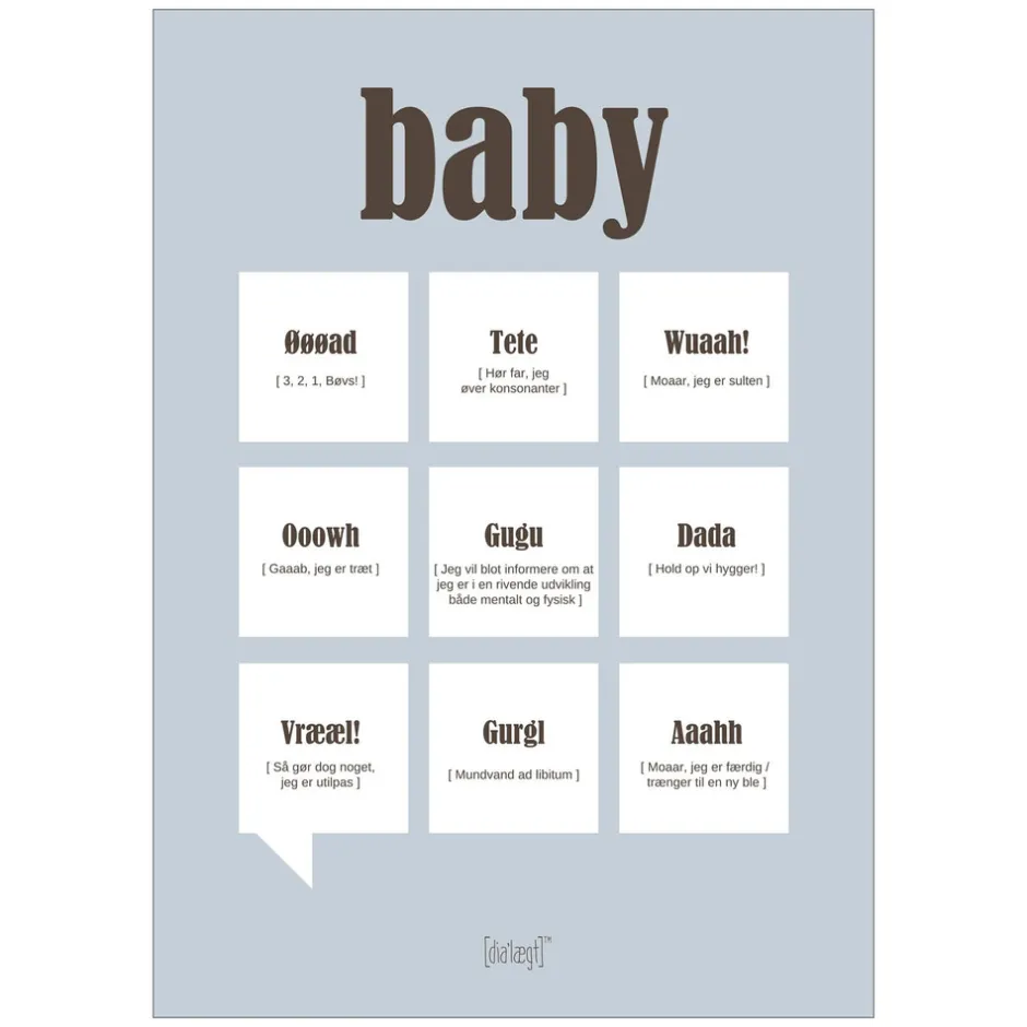 Plakat – Citat Baby A3 fra Poster & Frame er en charmerende og humoristisk plakat, der samler de klassiske babyudtryk og oversætter dem til sjove og genkendelige citater. Plakaten er ideel til børneværelset, hvor den både pynter og skaber smil hos både børn og voksne. Med sit enkle og moderne design passer den ind i de fleste indretninger, og den fungerer også perfekt som en personlig gave til nybagte forældre. De forskellige citater gør det nemt at genkende og forstå de smås lyde og udtryk, og plakaten kan være med til at skabe hyggelige samtaler om barnets udvikling. Dansk design og god kvalitet sikrer, at plakaten holder sig flot i lang tid.